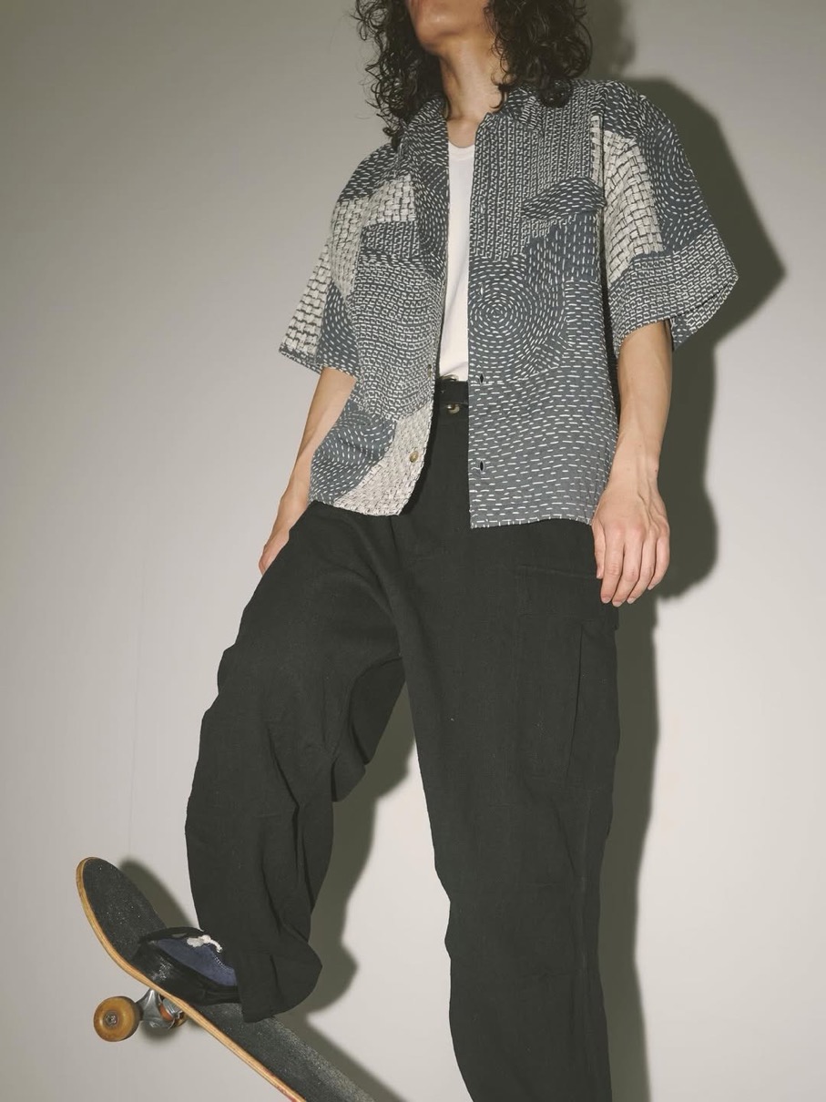量産品とは異なるわずかな個体の揺らぎが、そのまま服の表情として仕上がっている。