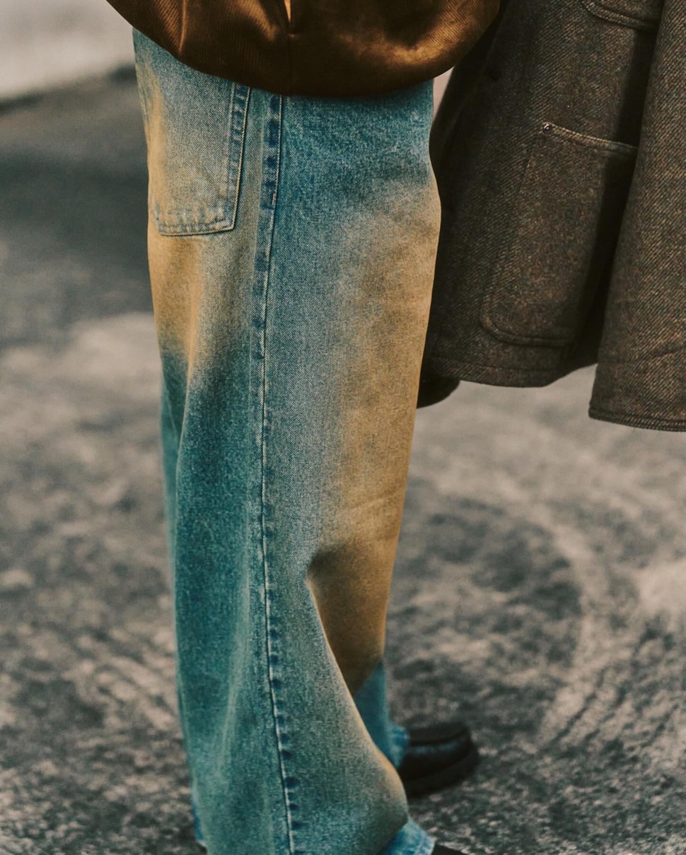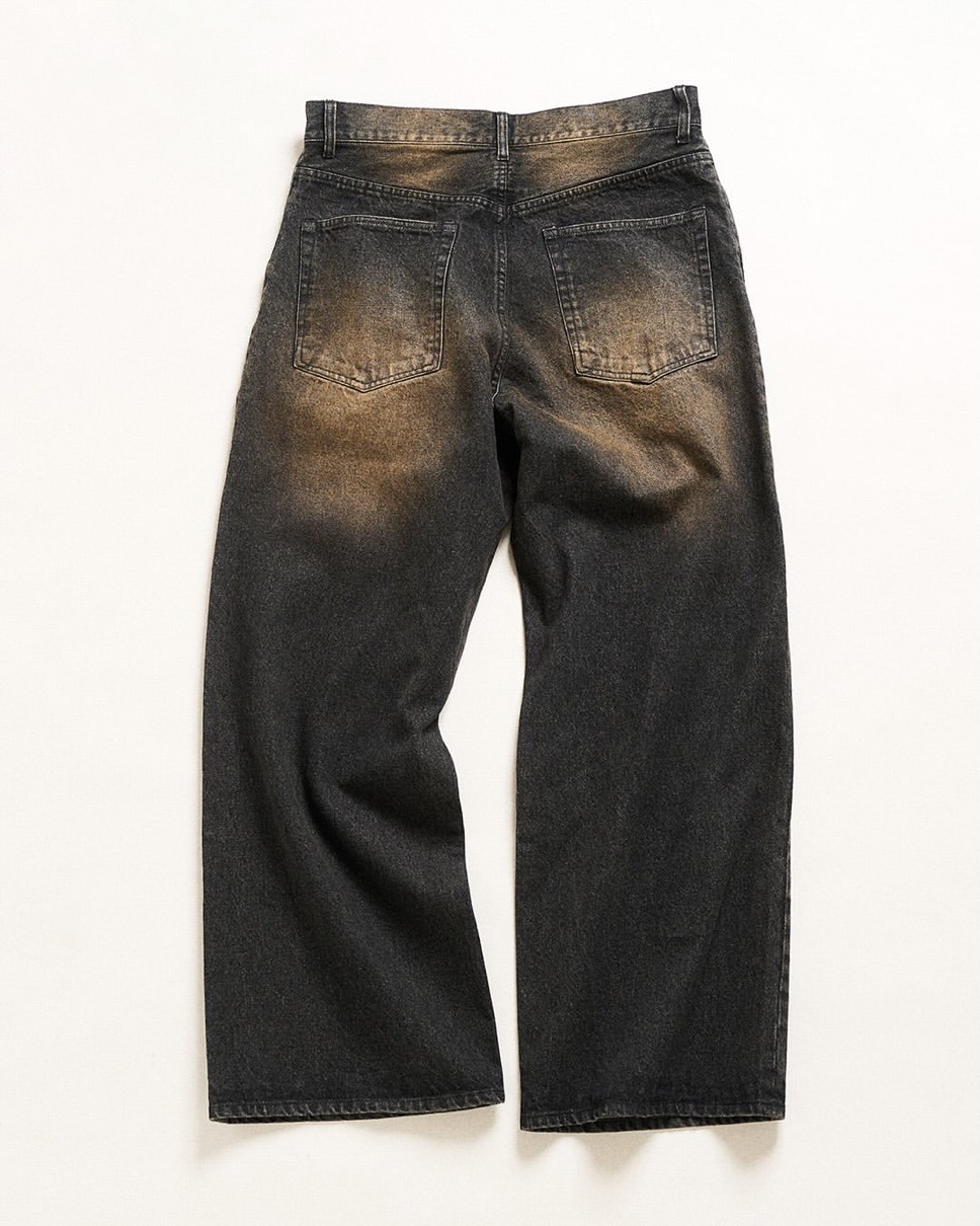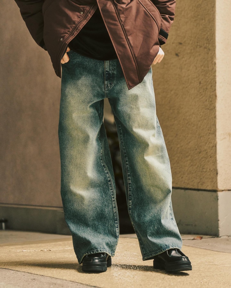 しっかりとした13.5ozデニムに加工を施し、穿き込んだようなリアルな風合いを再現。無骨すぎず、重すぎない絶妙な生地感はオールシーズン着用可能。シルエットは今気分の、程よいワイドストレートシルエットで、はじめから“こなれた雰囲気”を楽しめる一本。無骨すぎず重すぎない生地感は、オールシーズン使える絶妙なバランス。程よいストレートシルエットで脚のラインを拾わず、どんなコーデにも馴染み、Tシャツからニット、アウターまで合わせるだけでスタイルが決まる万能さもポイント。ヴィンテージの雰囲気を現代的に仕上げた、日常使いに最適な5ポケットデニムだ。