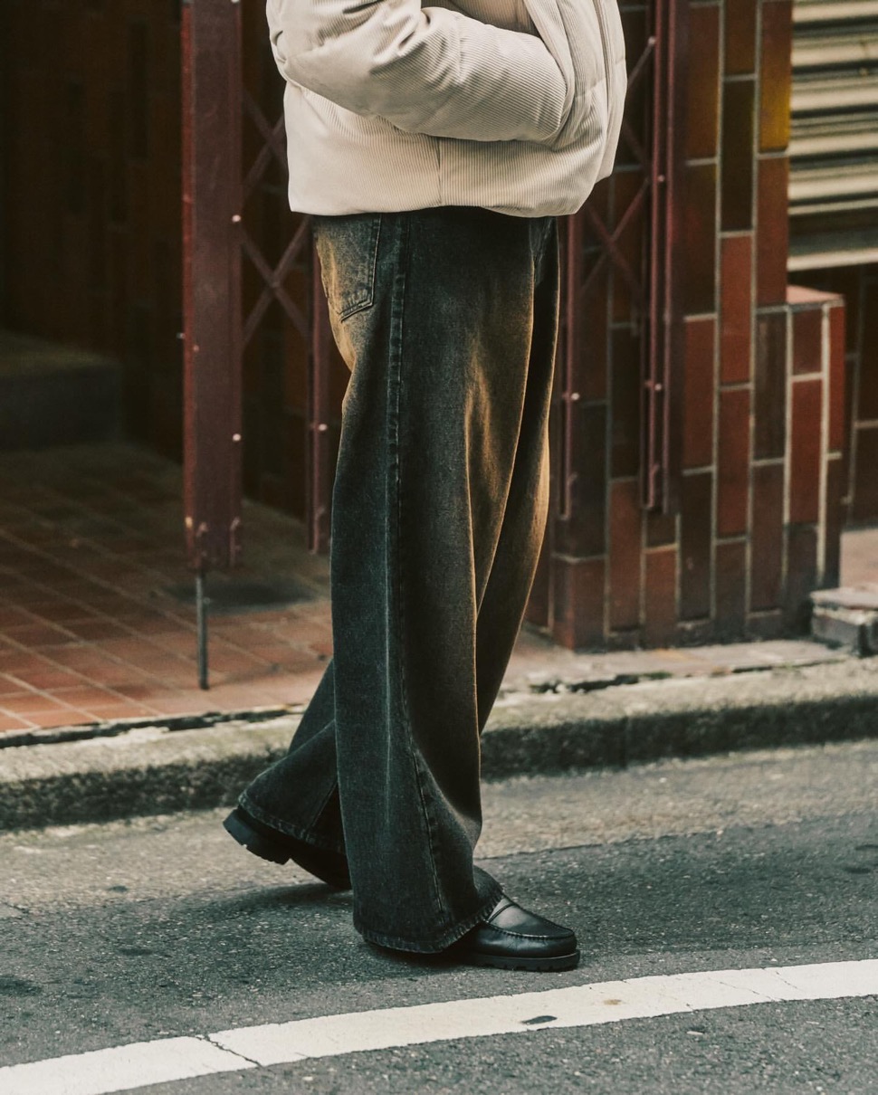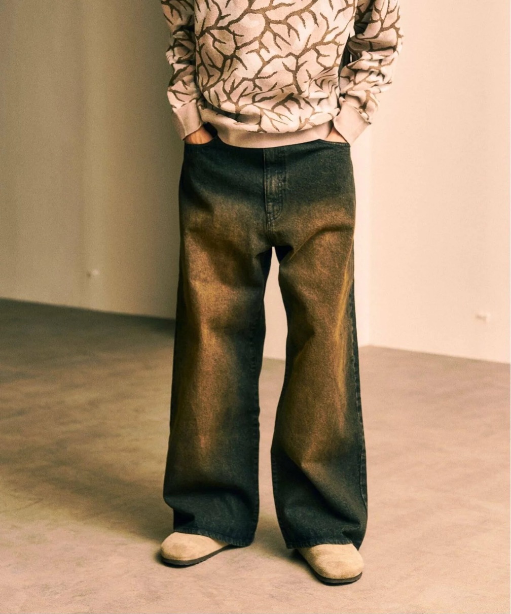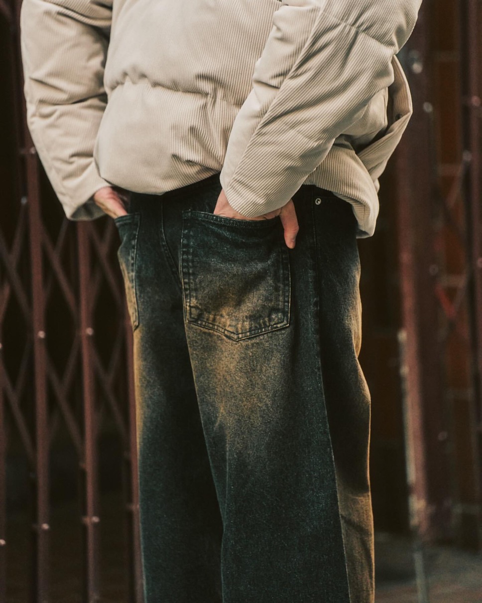 しっかりとした13.5ozデニムに加工を施し、穿き込んだようなリアルな風合いを再現。無骨すぎず、重すぎない絶妙な生地感はオールシーズン着用可能。シルエットは今気分の、程よいワイドストレートシルエットで、はじめから“こなれた雰囲気”を楽しめる一本。無骨すぎず重すぎない生地感は、オールシーズン使える絶妙なバランス。程よいストレートシルエットで脚のラインを拾わず、どんなコーデにも馴染み、Tシャツからニット、アウターまで合わせるだけでスタイルが決まる万能さもポイント。ヴィンテージの雰囲気を現代的に仕上げた、日常使いに最適な5ポケットデニムだ。