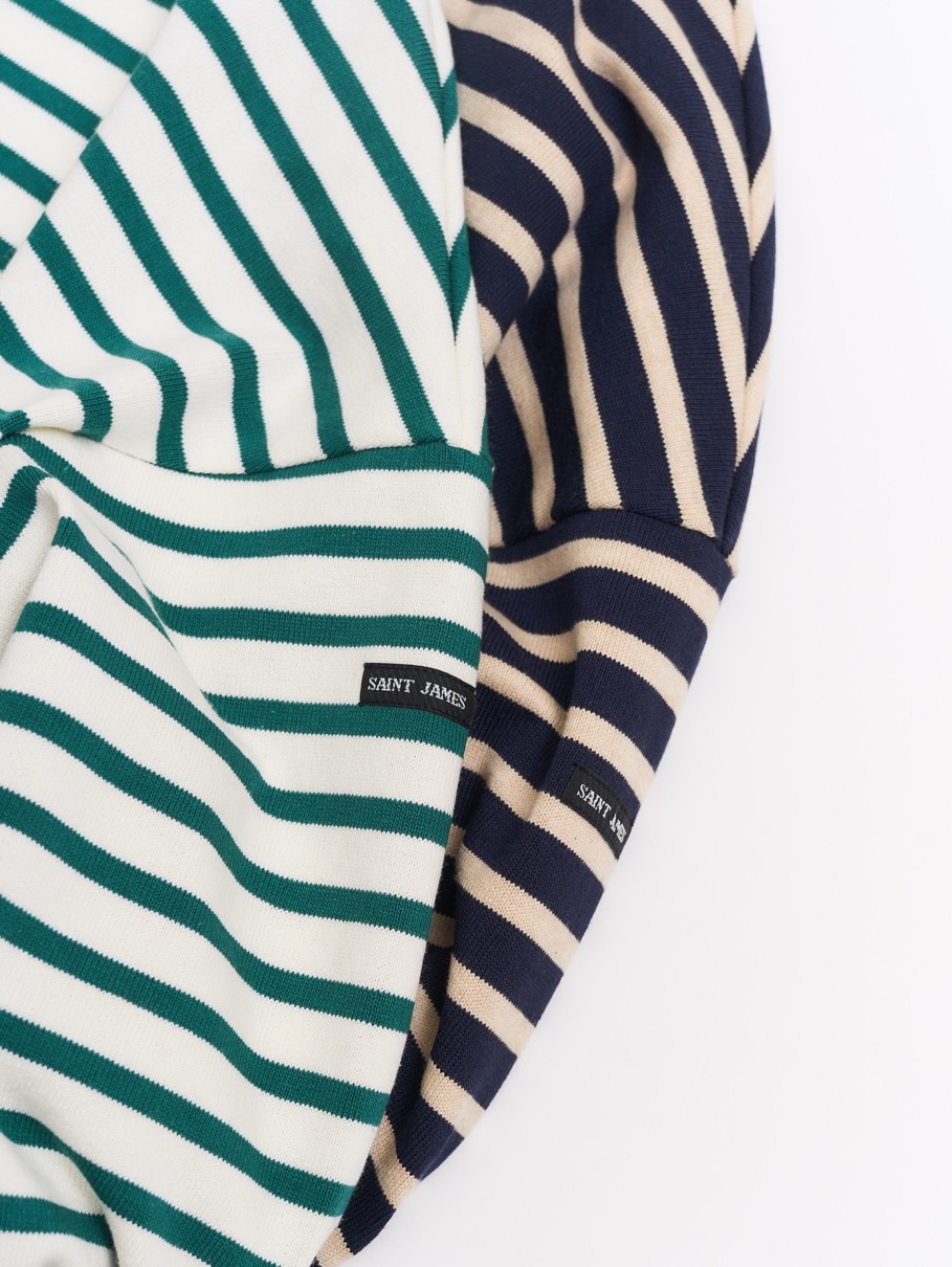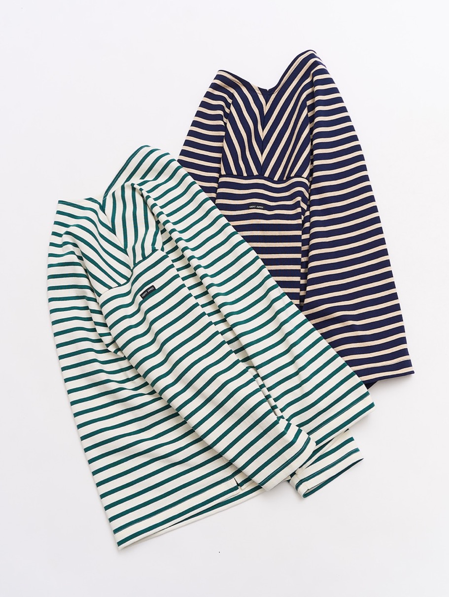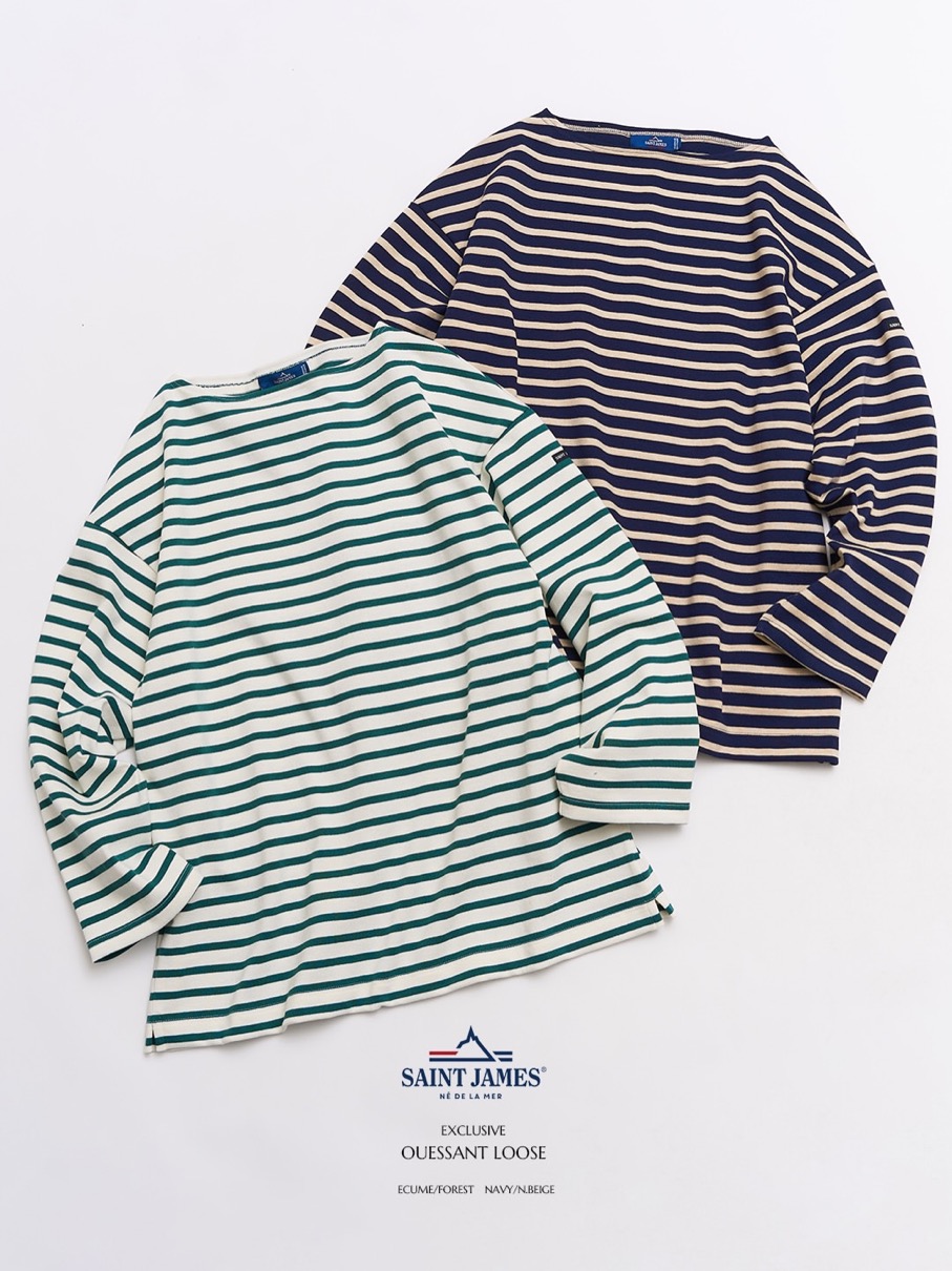 フランスを代表するバスクシャツメーカー「SAINT JAMES」の定番カットソーであるLOOSEシルエット『ウエッソンルーズ』をベースにしたカラー別注が登場。今までのバスクシャツから、これからのバスクシャツとして現代的なサイズフィッティングを活かした、NEW CLASSICな逸品。定番として揺るぎない人気を誇るネイビーベースに加え、シーズンムードを軽やかに演出するグリーンも用意。型は新定番として支持を集め、今の気分で着れる一着。
