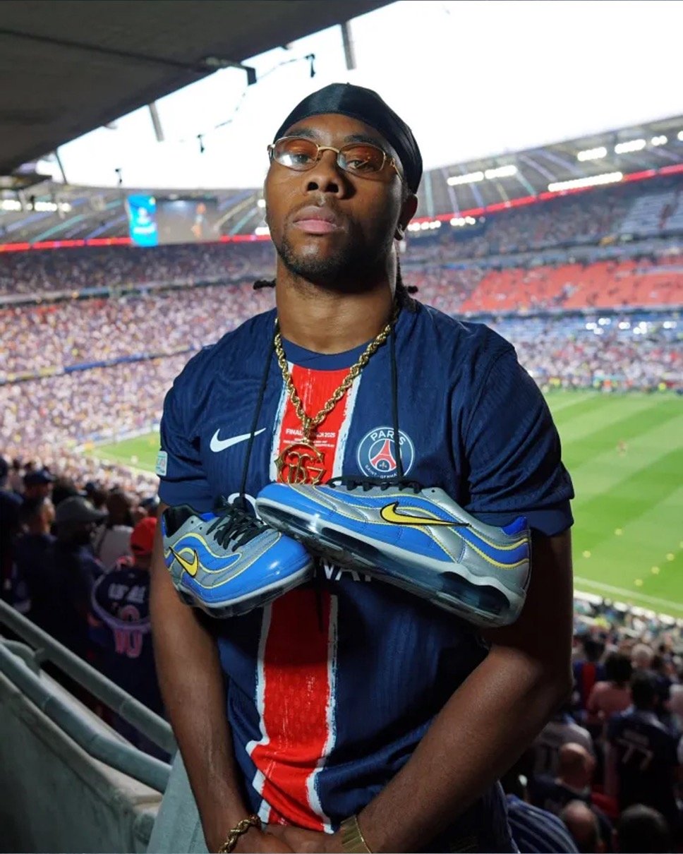 今回登場する『Cryo Shot Mercurial R9(クライオショット マーキュリアル R9)』は、ブラジルの怪物サッカー選手ロナウドが1998年のフランスワールドカップで履いていた伝説的なマーキュリアルR9クリート『Nike Mercurial Mk1 R9 “El Fenómeno”』からインスパイアされた一足。半透明のミッドソールの中には、クリート風のスタッズが凍り付いたかのようにあしらわれ、ノスタルジアをファッションステートメントに変えている。カラーは当時のモデルを再現したバーシティロイヤル、バーシティメイズ、メタリックシルバーの組み合わせで仕上げた。