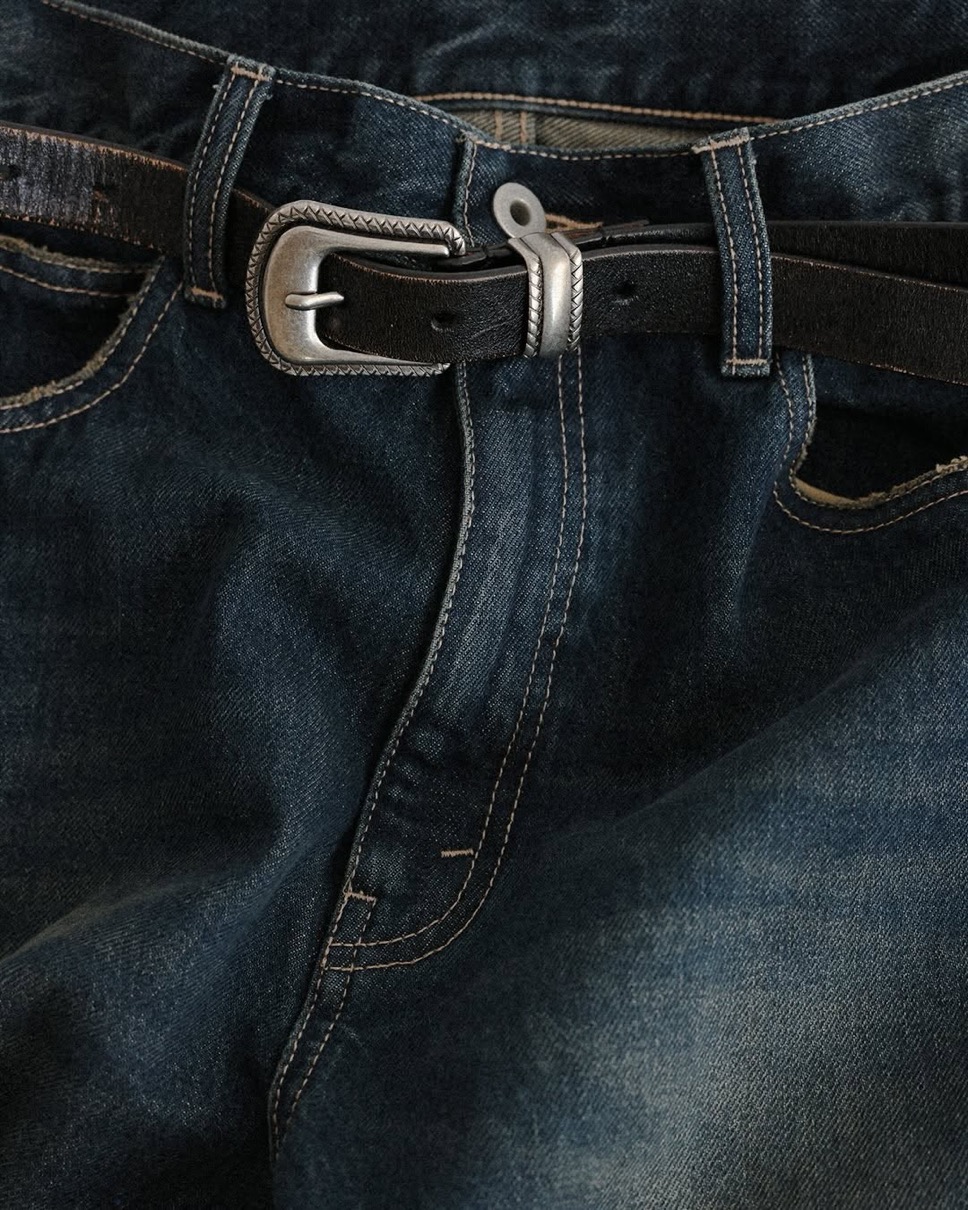 天然のフェード感を再現した13.75ozの重厚なデニムに、ナチュラルなヴィンテージ加工を施した後、グレーベージュをベースにした製品染めを実施。奥行きのあるスモーキーな色合いは、従来のインディゴとは異なる、やわらかいグレートーンを含んだ独自のカラーリングで、モダンな表情を生み出している。カラーはそれぞれブラック、ネイビー、ウォッシュドネイビーの3色が展開。