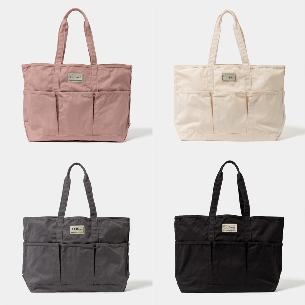 最大の特徴は、外側に前面・背面それぞれ3つずつ(計6つ)、さらに内側に1つの大容量ポケットを備えた高い収納力。ガーデニングツールの持ち運びを想定した設計ながら、タウンユースからキャンプなどのアウトドアシーンまで幅広い用途で使用可能。カラーはNATURAL、PINK、CHARCOAL、BLACKの全4色展開。通常はバッグ内側に配される「L.L.Bean」ロゴをあえて外側に施すことで、別注ならではの特別感を演出している。