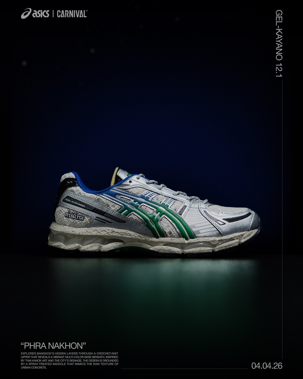 CARNIVAL®とASICSによる最新のコラボレーションでは、CARNIVAL®の15周年を記念して『GEL-KAYANO 12.1(ゲルカヤノ12.1)』をベースとした“PHRA NAKHON”を誕生させた。“PHRA NAKHON”(プラナコーン)は、タイ王国バンコク都の行政区の一つ。伝統文化と現代的なストリートのエネルギーが融合することで知られており、このスニーカーは、バンコクの歴史地区のアイデンティティからインスピレーションを得て、“プラナコーンの隠された層”というコンセプトのもとデザインされた。
