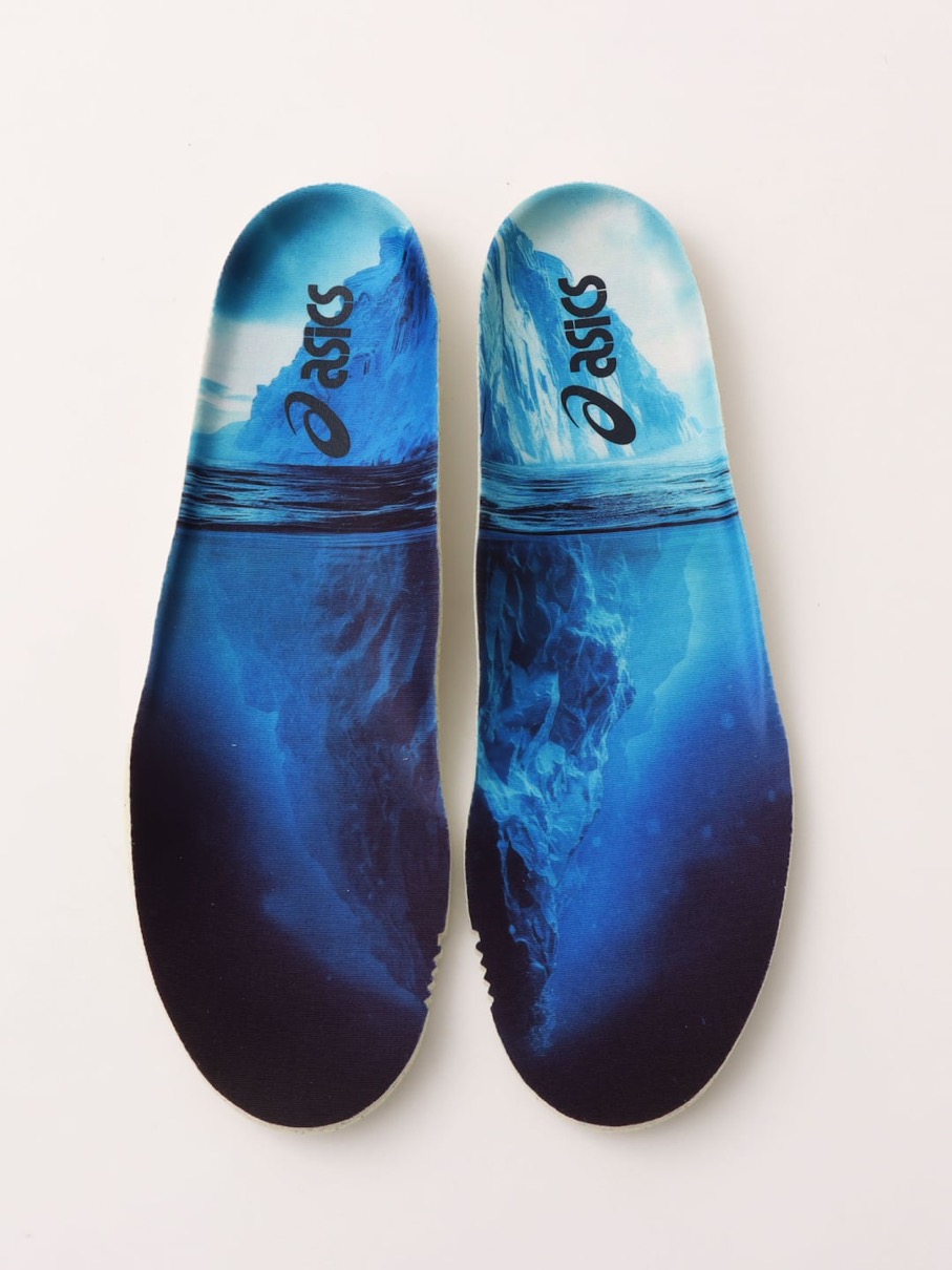 今回登場する一足では、神秘的で静かな美しさを持つ「氷山」からインスピレーションを受け、ホワイト、グレー、ブルーのカラーを配し、インソールには海面に浮かぶ氷山のグラフィックを施した。強さ、安定性、そして内に秘めた可能性を象徴する氷山は、目に見えるのは一部に過ぎずその奥には計り知れない力が眠っているストーリーが、今作へのデザインに落とし込まれている。
