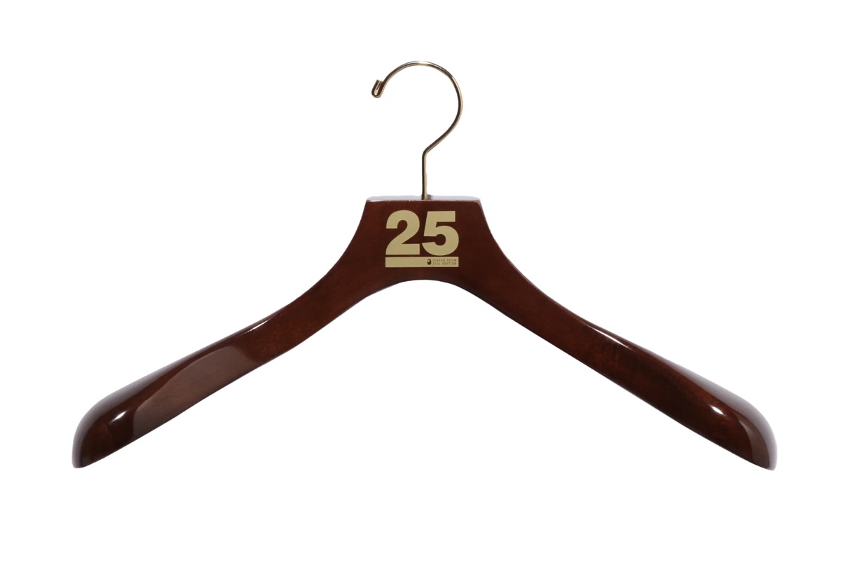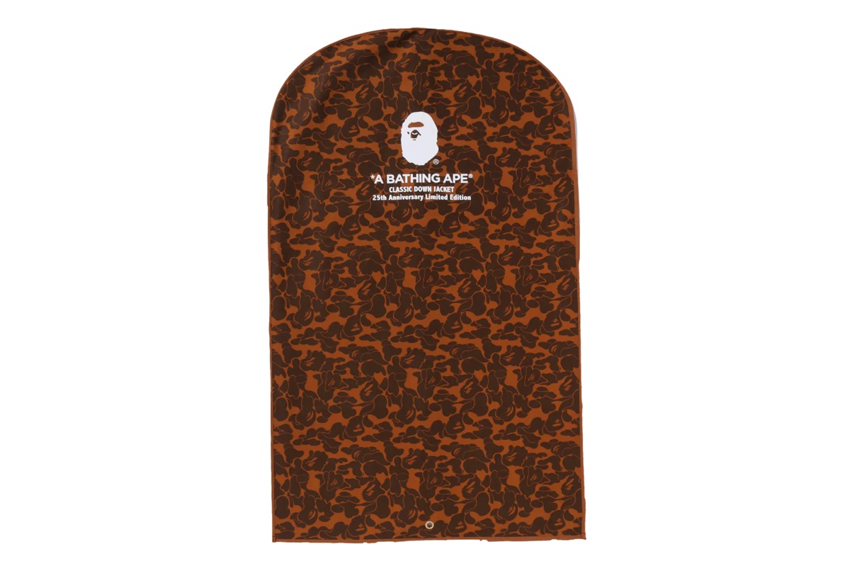 襟元には限定モデルであることを示す「25」の型押しレザーパッチと、一着ごとに異なるシリアルナンバーが刻まれ、特別なモデルであることを証明。付属するウッドハンガーにも25ロゴをあしらい、ガーメントバッグにはBAPE® CAMOを全面に配したデザインを採用、まさにコレクターズアイテムな逸品。
