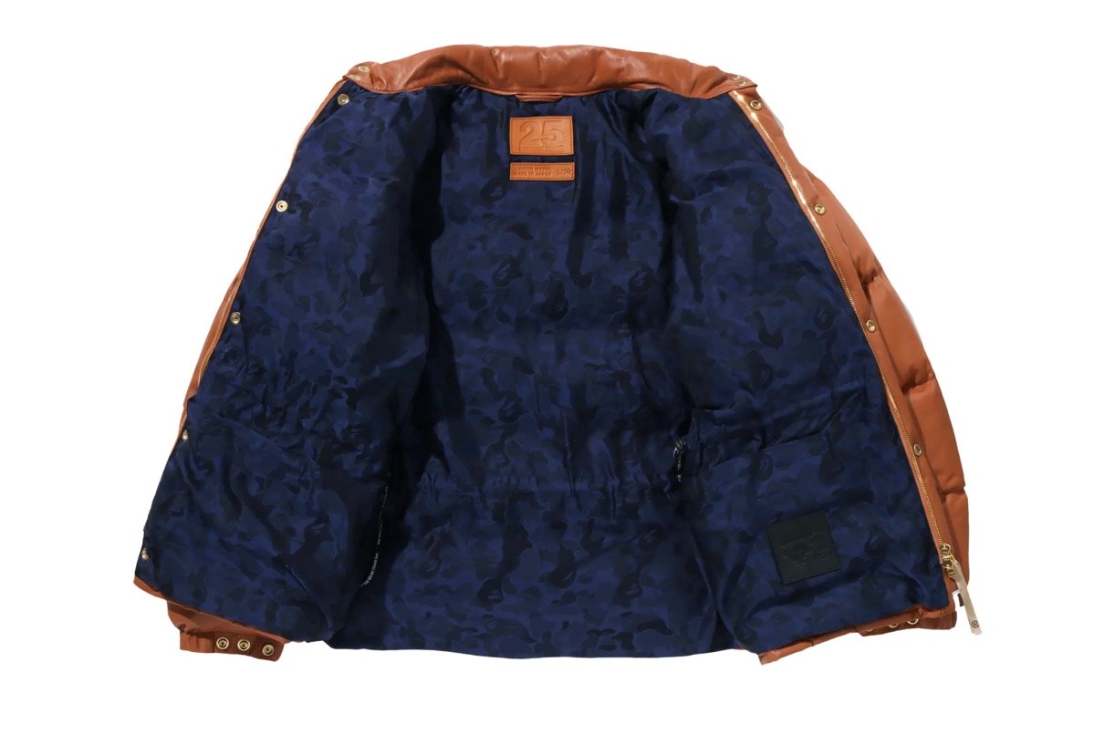 今回、このジャケットの誕生25周年を記念し、世界限定50着のみ生産される日本製の「25TH EDITION」が登場。限定の「25TH EDITION」はBAPEXCLUSIVE™ 青山、BAPE STORE®︎ 銀座、BAPE STORE® DOVER STREET MARKET 銀座BAPE STORE®京都、BAPE STORE® COMME DES GARCONS 大阪および BAPE.COM WEB STORE にて限定リリース。シグネチャーであるブラウンレザーは、特別に選び抜かれたシープスキンを採用し、柔らかさと耐久性を兼ね備えています。着るほどに体に馴染み、時間とともに風合いを増すその素材は、長く愛用できる一着としての価値を約束してくれる。