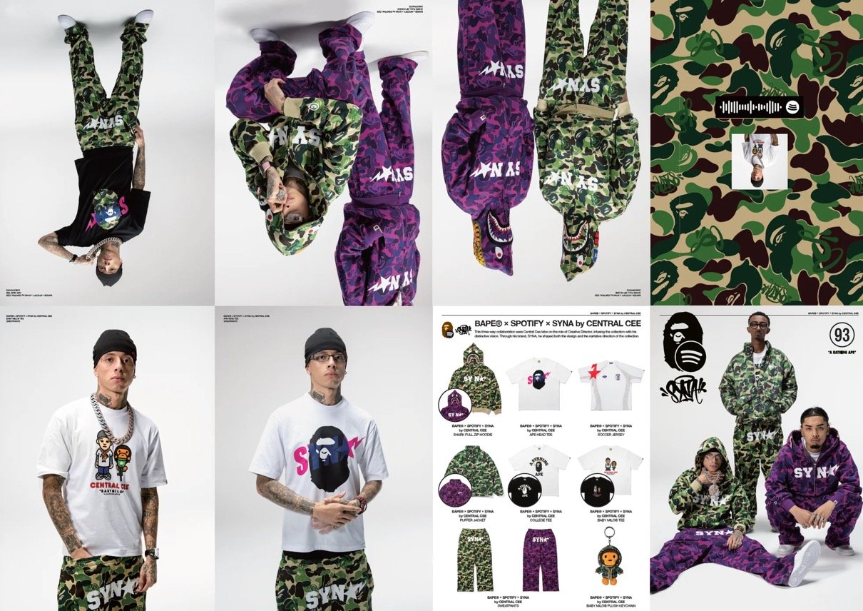 日本発のストリートブランドBAPE®(ベイプ)こと「A BATHING APE®(ア ベイシング エイプ)」と、ストリーミングサービス「Spotify(スポティファイ)」、UKラップ界の革命児 Central Cee(セントラル・シー)が手がけるブランド「SYNA WORLD(シナ・ワールド)」によるコラボコレクションが、国内2025年11月25日(火)より発売予定。