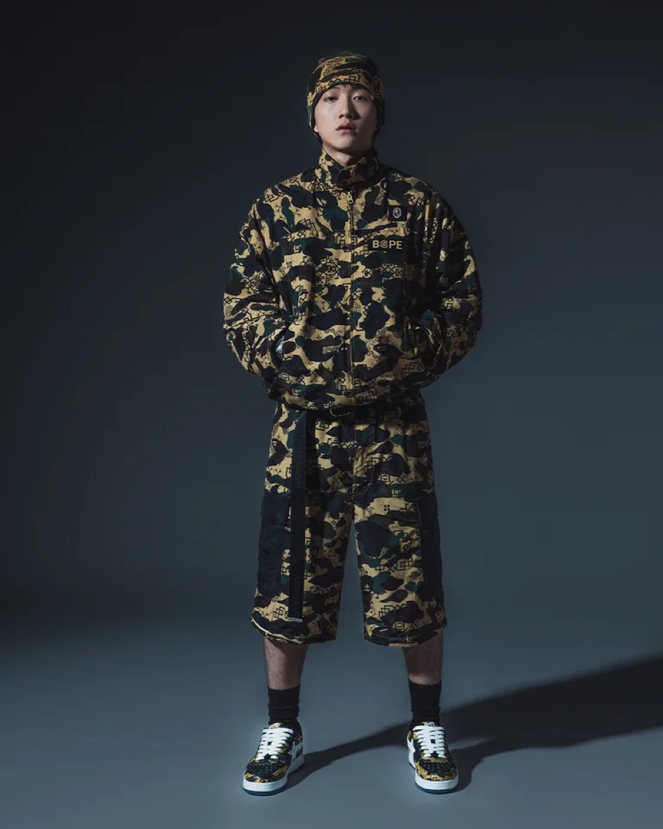 BAPE®の定番スニーカー「BAPE STA™」も、コラボレーション仕様にアップデート。アッパーには特別なカモ柄を採用し、アウトソールにはシャークとドラゴンのグラフィックを透過プリントで表現。両ブランドのアイデンティティを足元から際立たせる一足。