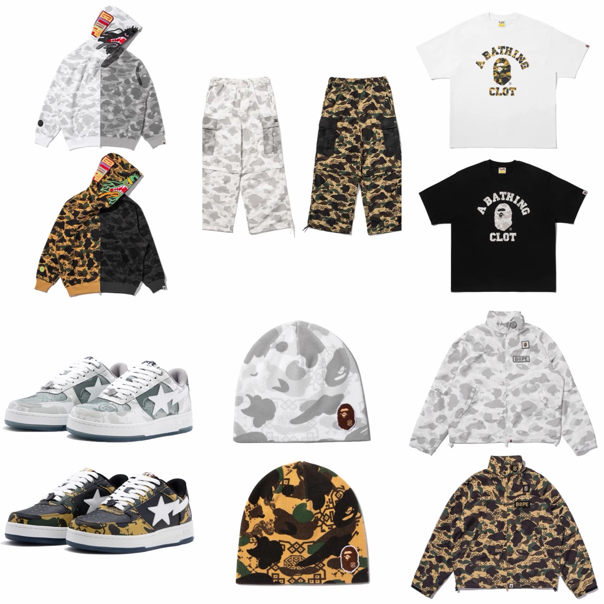 1993年に誕生したストリートブランド BAPE®(ベイプ)こと「A BATHING APE®(ア ベイシング エイプ)」と、Edison Chen(エディソン・チェン)がディレクターを務める香港発のストリートブランド「CLOT(クロット)」による新作コラボコレクションが、国内2026年1月17日(土)より発売予定。