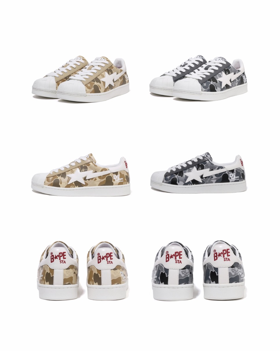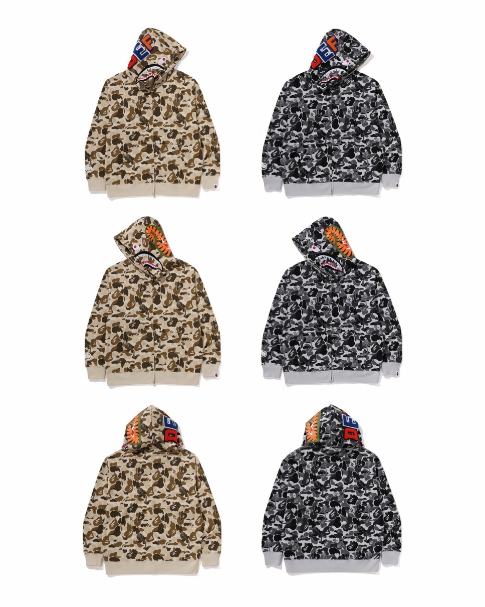 本コレクションは、“FEARLESS EXPRESSION(恐れずに表現すること)”をテーマに掲げ、ヒップホップ界を代表するアーティスト Onyx と Redman を起用したキャンペーンビジュアルで展開。コレクション全体に、今回のためにデザインされた特別なカモフラージュ柄があしらわれている。ラインナップには、BAPE®を象徴するシャークフルジップフーディーをはじめ、カレッジロゴTシャツ、総柄Tシャツ、そしてBAPE®︎黎明期を象徴するフットウェア、SKULL STAが揃う。