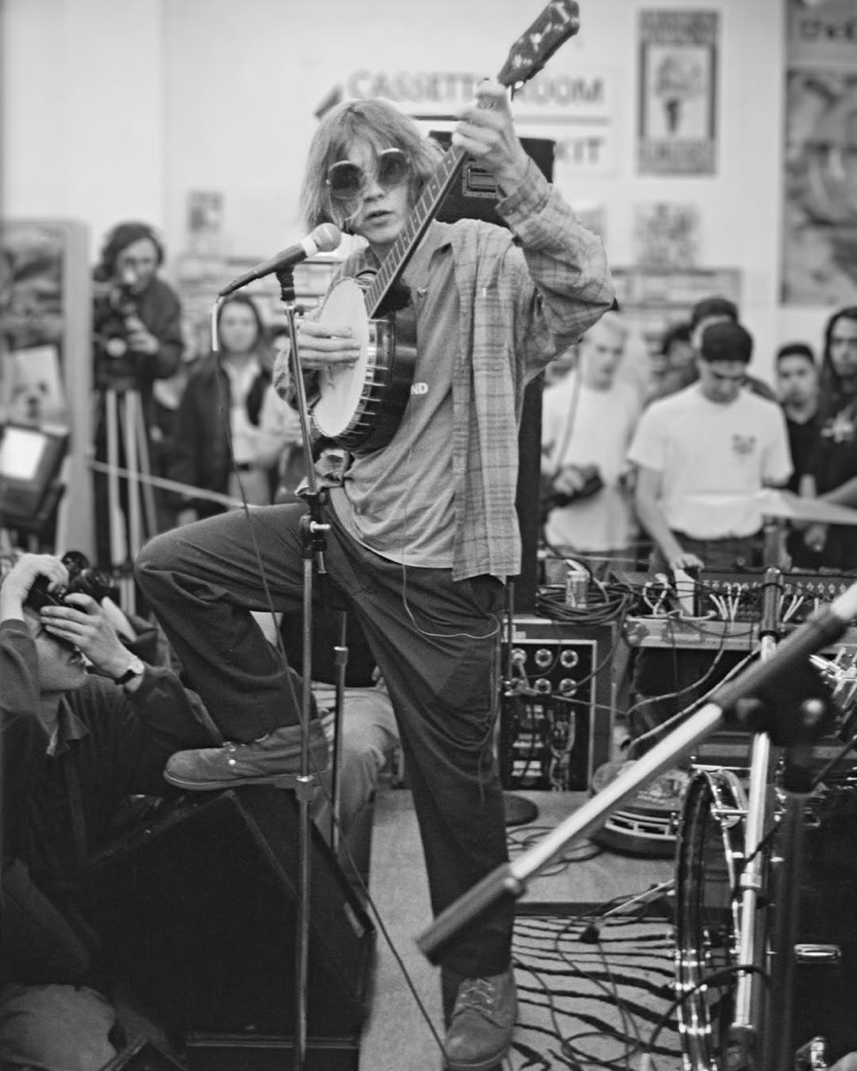 ロサンゼルス・ハリウッドの名店「アーロンズ・レコード・ストア」で行われたライブパフォーマンスを撮影。BECK(ベックのダイナミックなステージプレゼンスと、ストア特有の熱気ある空気感を捉えた一枚。この会場は地元では音楽ファンが集う人気スポットで、セレブから一般客までが交わるカルチャーの交差点でもあった。写真からは、1990年代初期のロサンゼルスのローカル音楽シーンが生き生きと蘇る。