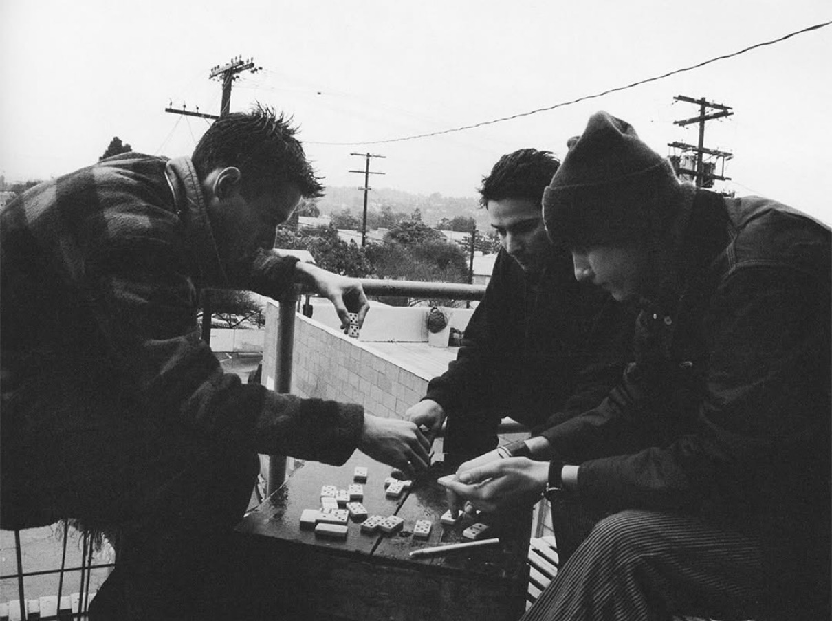ロサンゼルス、アトウォーター・ヴィレッジの「G-Sonスタジオ」での撮影中に捉えた一幕。雨模様の中、非常階段でドミノ遊びを楽しむビースティ・ボーイズの姿は、ステージ上とは異なるリラックスした表情を見せている。仲間同士の信頼と絆、そして90年代トリートカルチャーの自由な空気が漂う、ショーンらしいスナップショットだ。