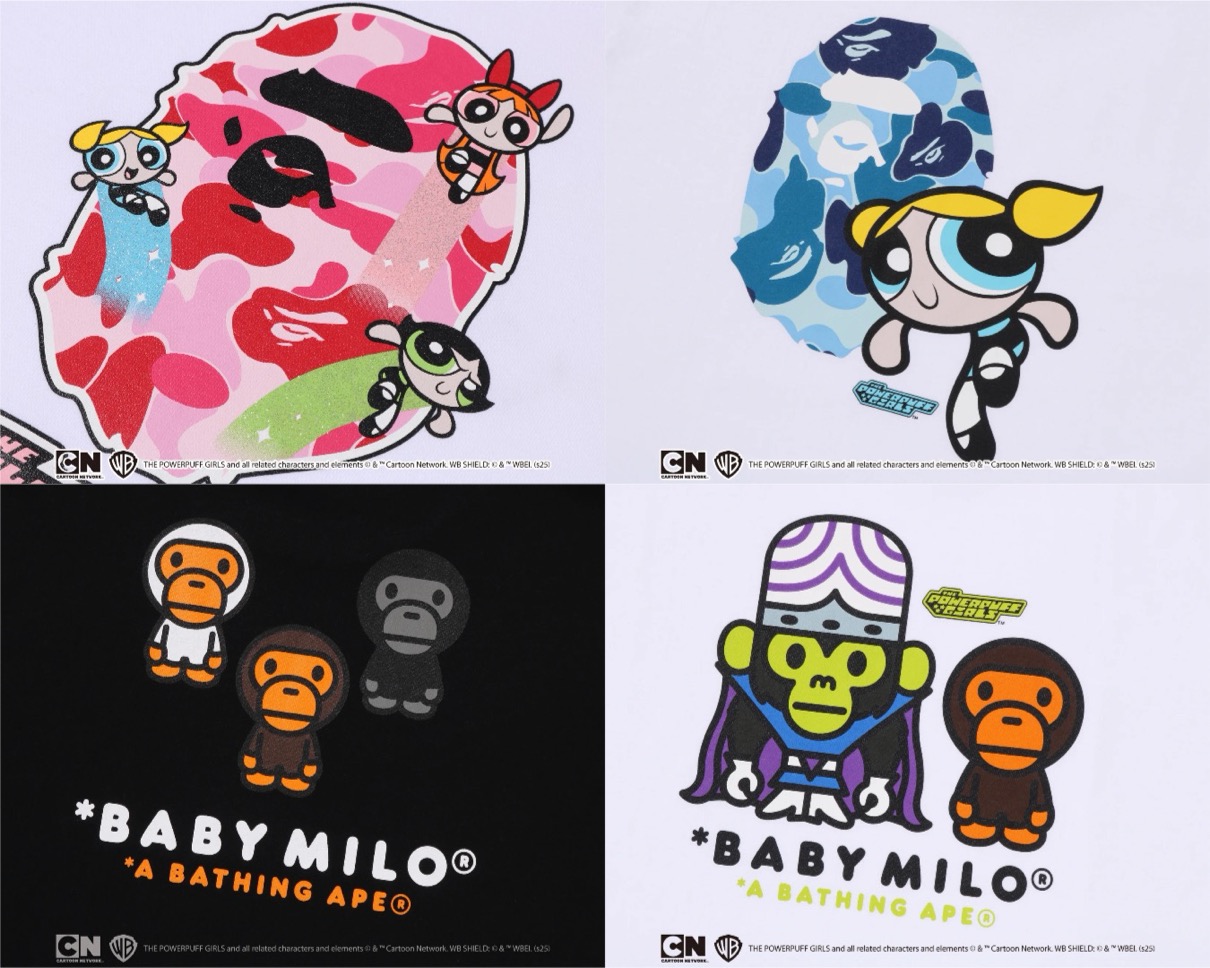 また、ブロッサム、バブルス、バターカップのキャラクターカラーに合わせて、ピンク、ブルー、グリーンのABC CAMOをそれぞれAPE HEADと組み合わせたグラフィックTシャツも登場。こちらはホワイトのみの展開で、3人の個性を際立たせる1枚に仕上げている。さらに、パワーパフ ガールズとBABY MILO®︎が共演するデザインも加わる。フロントにBABY MILO®︎姿の3人を、バックに3匹のBABY MILO®︎を配したTシャツをブラックとホワイトで展開。