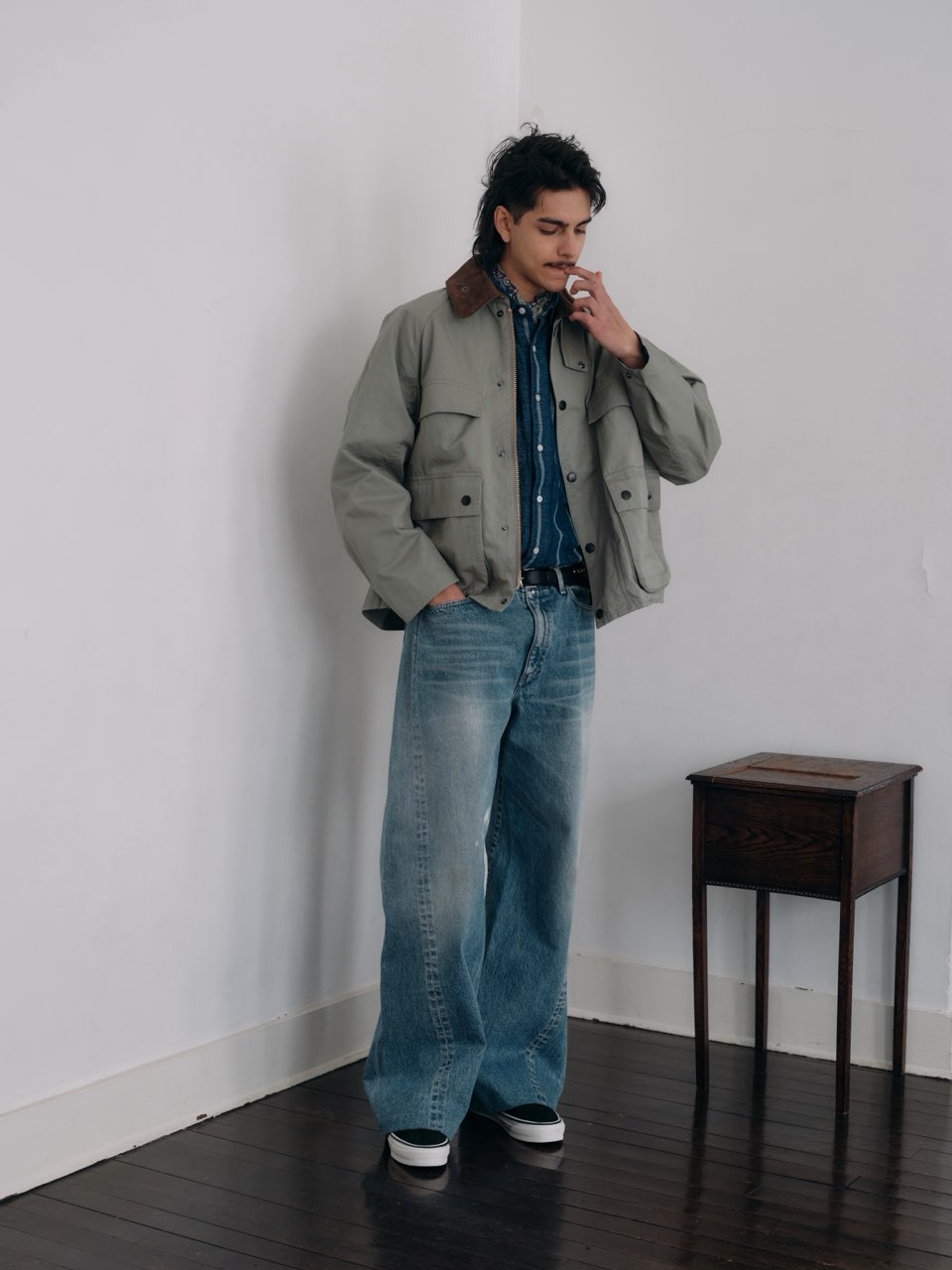 26SSシーズンの別注ポイントとして、まずはクロップド丈へのアレンジ。OLD BEDDALEのフロントポケットデザインを踏襲しつつ、TRANSPORT JACKETを彷彿とさせる短めの着丈に変更。クロップド丈にすることで、胸ポケットと腰ポケットの間隔を詰め、コンパクトかつ現代的なバランスに仕上げている。さらに、身幅・袖幅ともにややワイドに設定し、リラックス感のあるオーバーサイズフィットに。レイヤードにも対応しやすいシルエット。