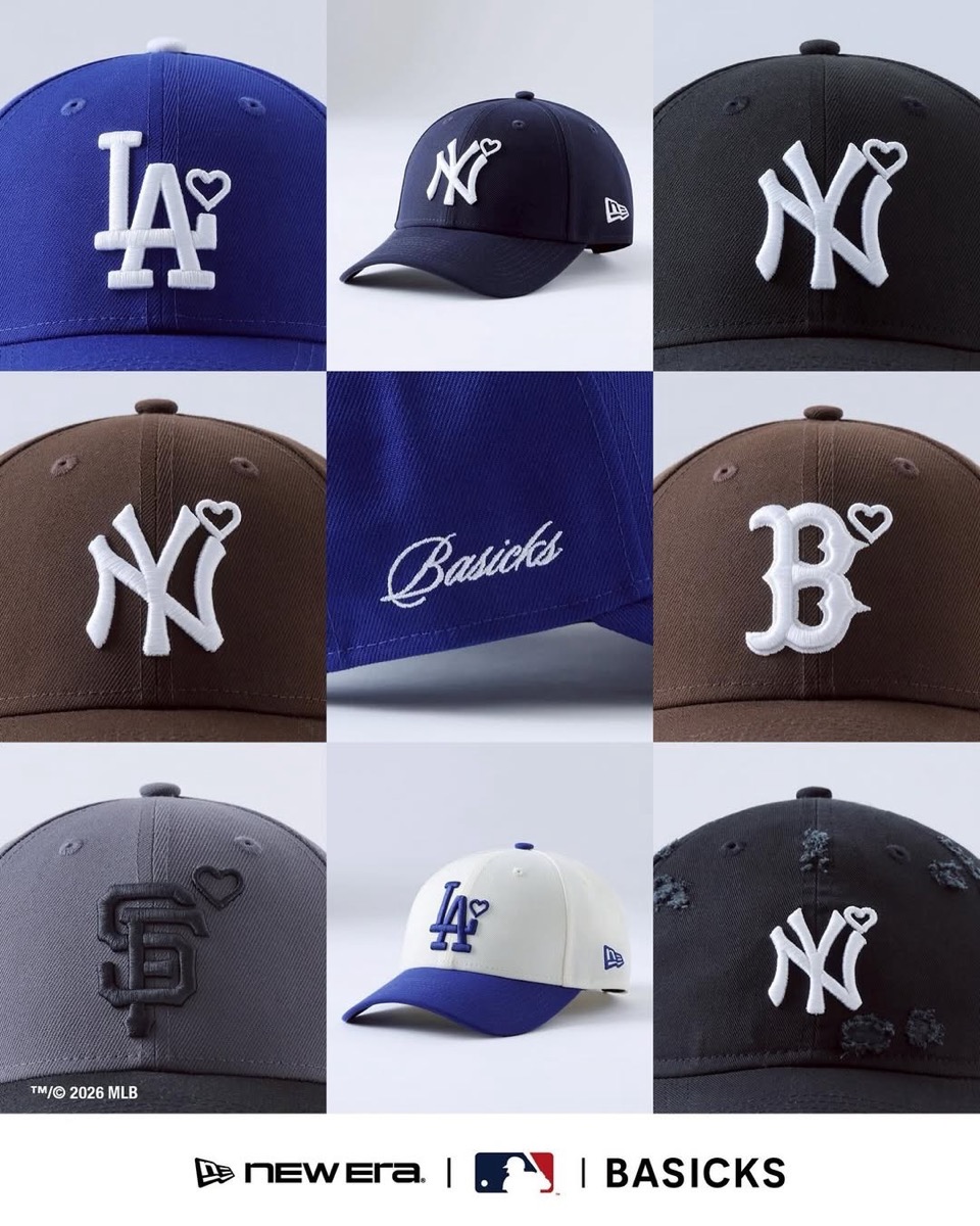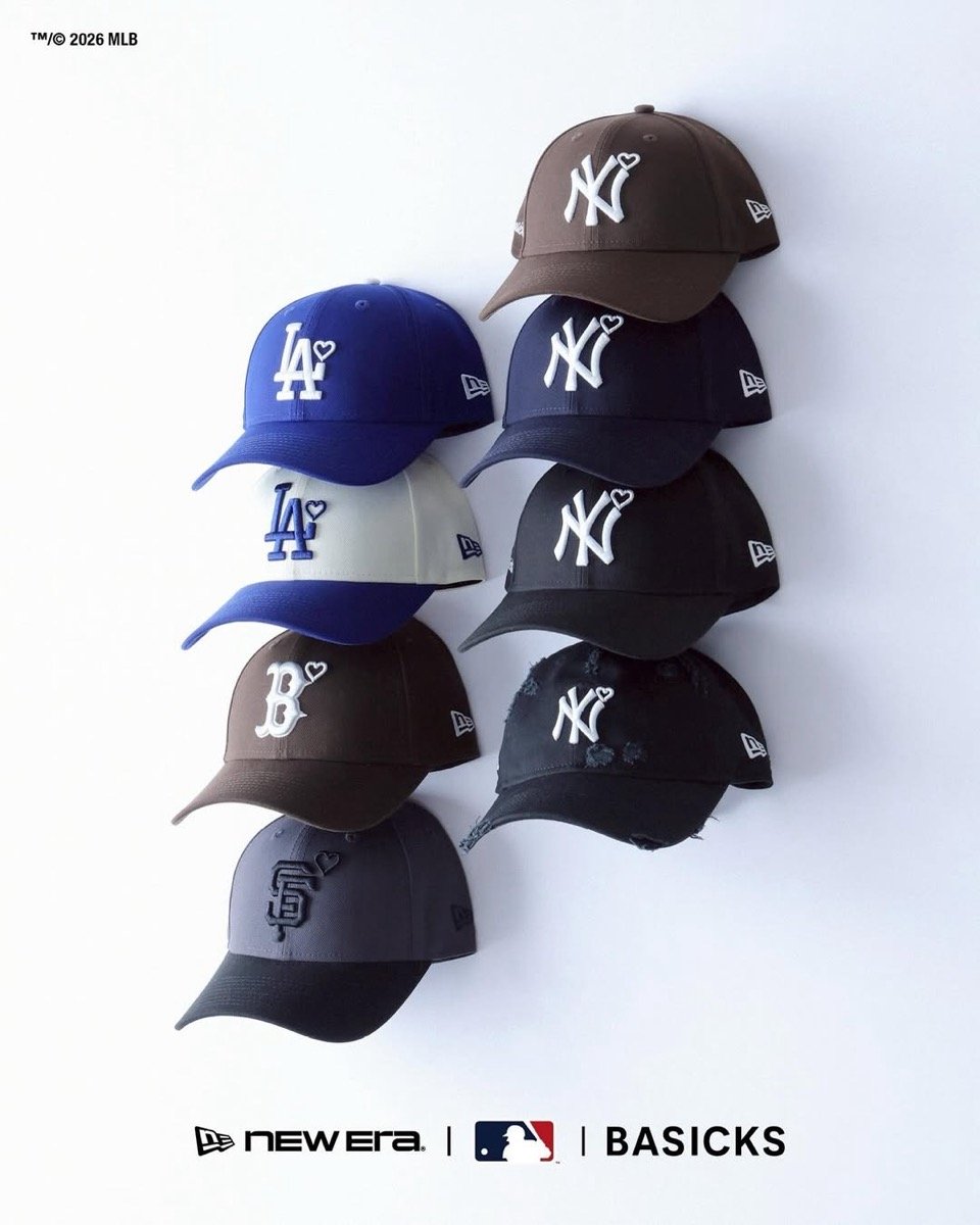New Era®︎とBASICKSのコラボレーションから新作MLBコレクションが発表。今回も9FORTY™キャップをベースに採用し、定番のロサンゼルス・ドジャースやニューヨーク・ヤンキースに加え、ボストン・レッドソックスとサンフランシスコ・ジャイアンツ をBASICKSとして初めてフィーチャーしている。チームロゴにBASICKSのシグネチャーであるハートモチーフを添えた、スポーツとブランドの感性が交差するデザイン。
