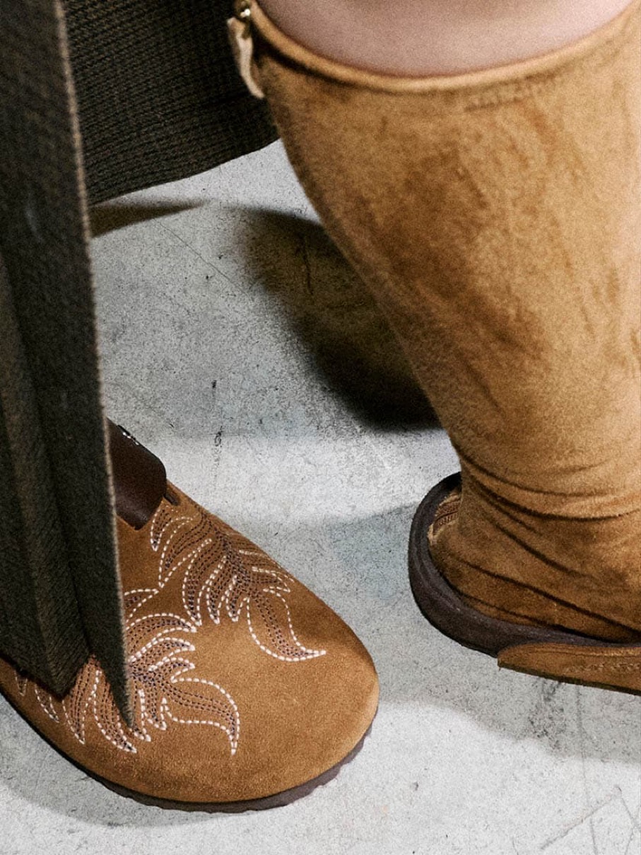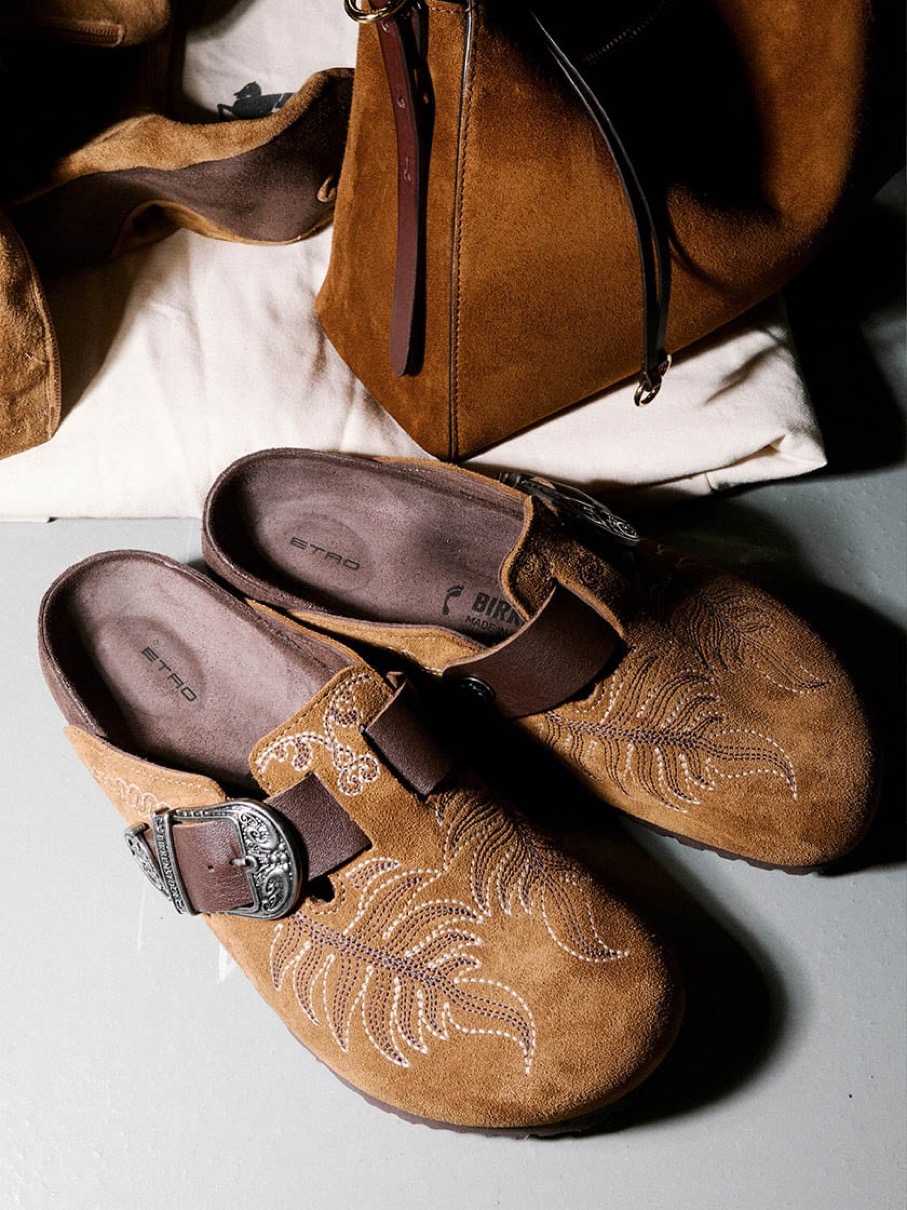BIRKENSTOCK&ETROが、イタリアの職人技の伝統とドイツの感性が溶け合う、本質的で時代を超えたデザインのユニークなコラボレーションを発表。現地時間2026年2月25日にミラノ・ファッションウィーク、ETROの2026/27年秋冬ランウェイショーにて初披露された本コラボレーションでは、長い伝統を誇るクラフトマンシップと、ETROの異なる要素を調和させる美学が見事に溶け合う。〈BIRKENSTOCK〉ブランドを代表するアイコニックモデル『Boston(ボストン)』に、ETROの独創的な視点を通して新たな息吹を吹き込んだ。上質なスウェード素材のアッパーに象徴的な刺繍が施され、フットベッドには両ブランドのロゴが刻まれている。
