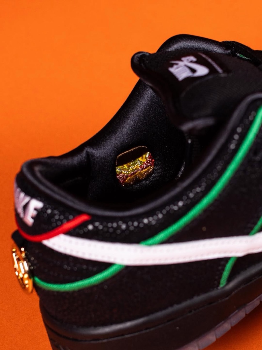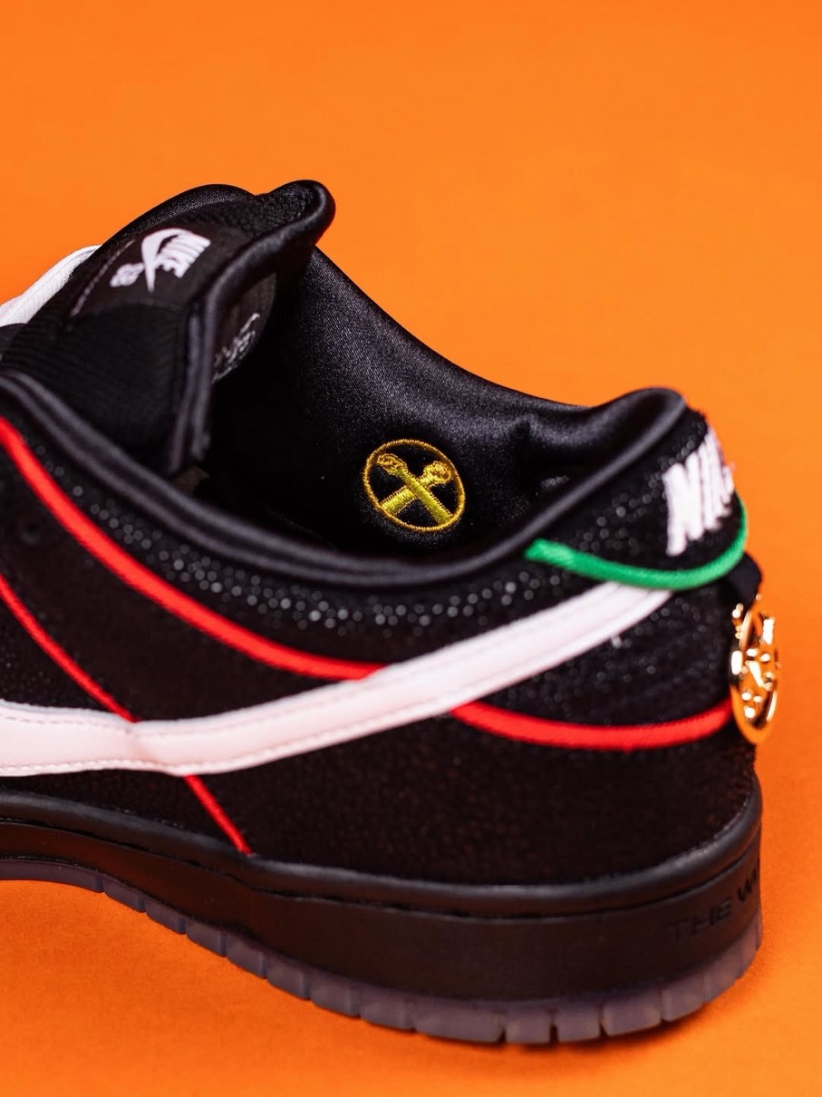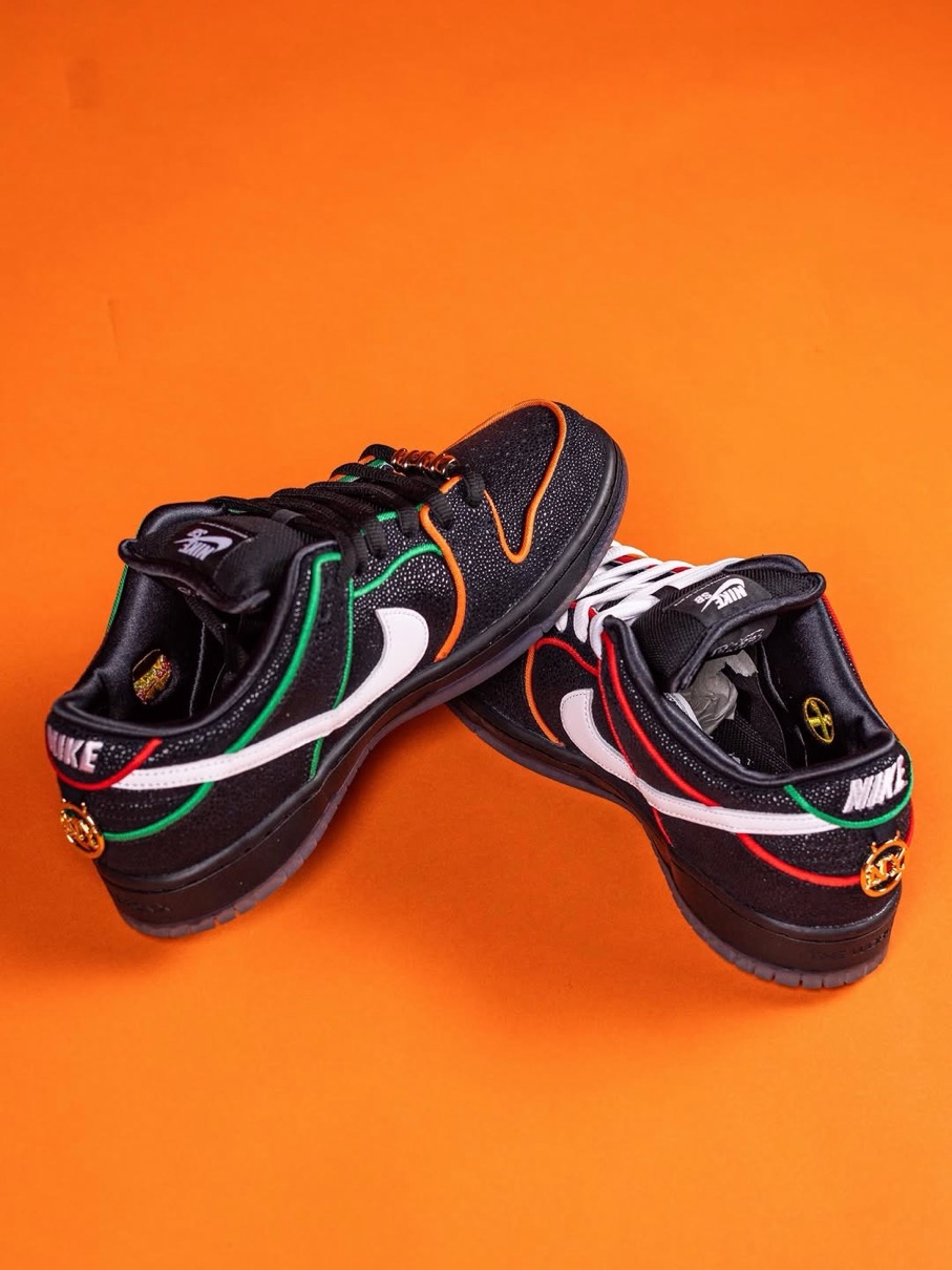 今作でベースとなるのは、ナイキの人気スニーカー「ダンク(Dunk)」のSBローカットモデル。女性やトランスジェンダーのスケーターのために、安全で包摂的な空間を創造するために設立された『Bronx Girls Skate(ブロンクスガールズスケート)』は、ニューヨークのスケート文化の柱として成長してきた。今回のナイキSBとのコラボレーションは、彼らの文化的関連性を強調し、コミュニティに根ざした組織と連携するパターンに沿ったもの。ブラックの粒状テクスチャーのアッパーが特徴的で、パイピングにはチャレンジレッドやトータルオレンジ、グリーンのグラデーションカラーが落とし込まれている。ヒールにはゴールドのメッキパーツがあしらわれ、左足ヒールのソール部には「THE BRONX」、もう一方には「THE WORLD」の文字が刻印。これにはシンプルで直接的でありながら、深い意味が込められている。さらに、スペシャルデザインのグラフィックインソールも付属する。