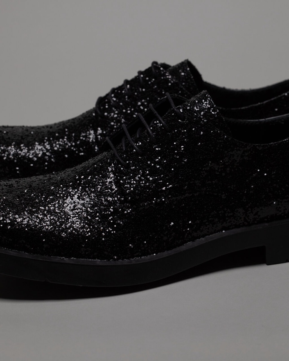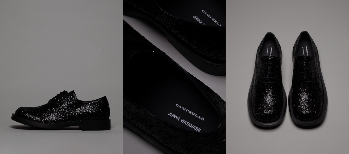 ウィメンズライン「JUNYA WATANABE」は、CAMPERLABを代表するモデルのひとつ「MIL 1978」をベースに。「MIL 1978」は、70年代からインスピレーションを得たクラシックなスタイルで、独特のフォルムとボリューム感が特徴的なモデル。こちらは職人が1足ずつブラックグリッターを施し、特別な一足に仕上げられている。アッパー、ソール、インソールまですべてブラックで統一し、スタイリッシュな佇まいに。極細のシューレースで上品さも演出した。