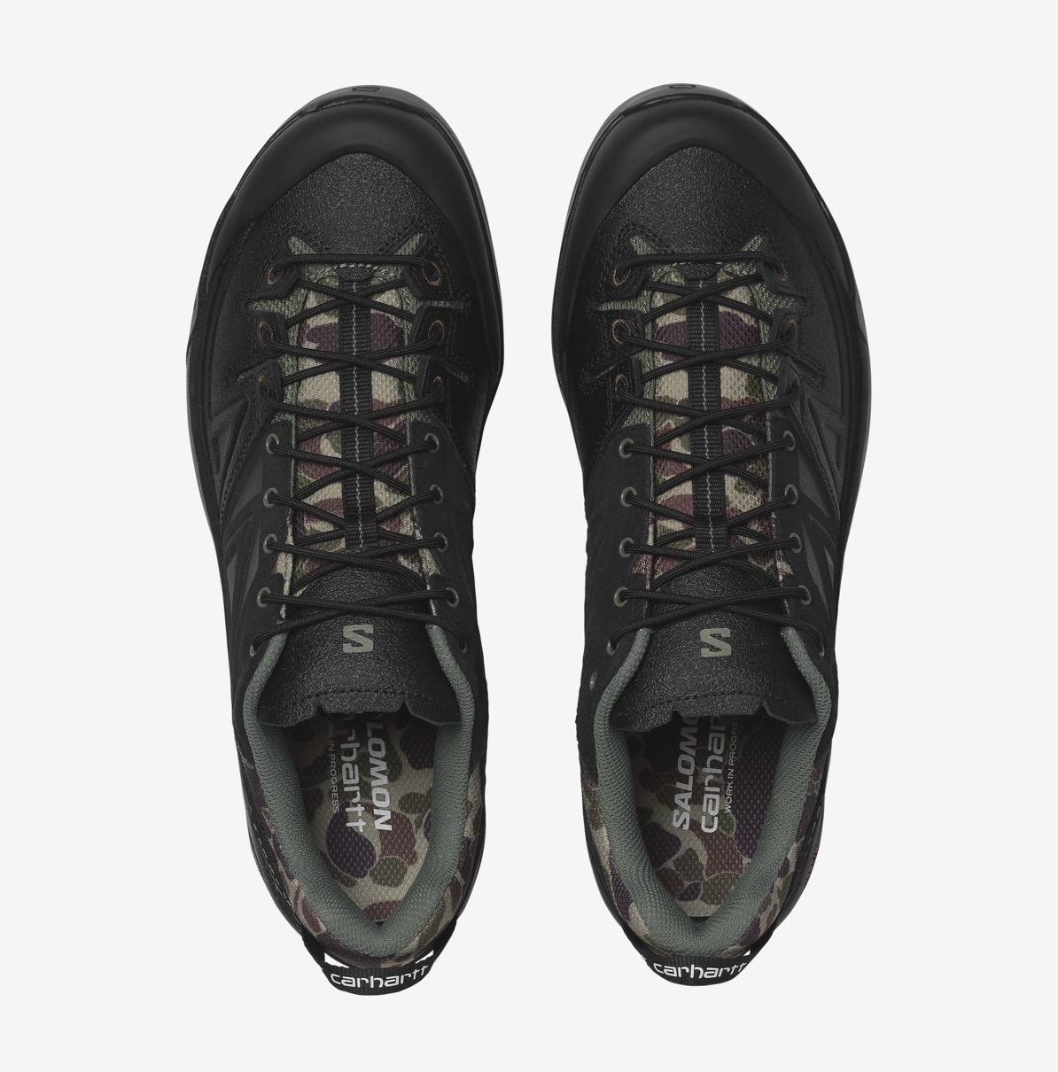 〈Salomon〉のテクニカルシューズ『X-ALP™』は、〈Salomon〉が培ってきたマウンテンアクティビティのノウハウを背景に、テクニカルなアプローチシューズから着想を得たモデル。ラギッドなソールユニットと耐久性に優れたアッパーを組み合わせ、街からフィールドまでをシームレスに繋ぐハイブリッドなデザインが魅力。今回登場するカーハート WIPとの新作コラボモデルでは、タフなスタイルと実用的なデザインをシームレスに融合。耐久性に優れたブラックのレザーとテキスタイルのアッパーで仕上げられたこのスニーカーは、美しい外観と品質の両方を重視する人々に最適な一足。カモフラ柄がアクセントとなる履き口とテキスタイルライニングが快適性を確保し、頑丈なラバーソールが確かなグリップ力を提供。都会的な環境にも完璧に調和するX-ALPのミニマルなシルエットとプレミアム素材が、どんな装いもさりげなく格上げ。洗練されながらもリラックス感のある一足となっている。