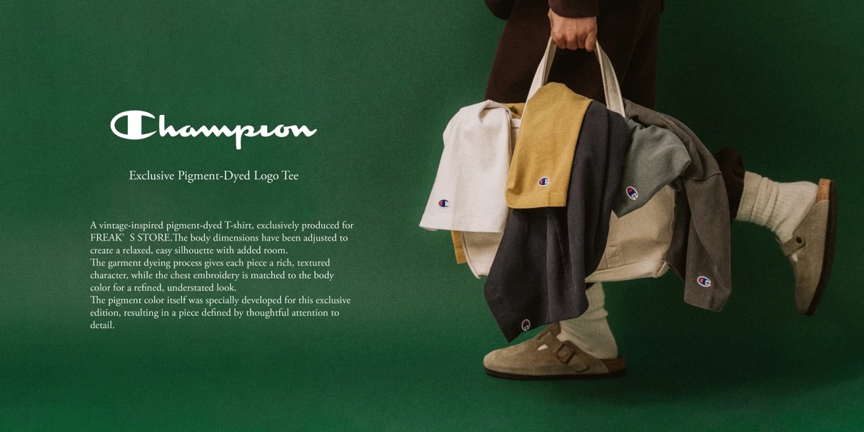 FREAK’S STOREがChampionに別注したTシャツは、3月下旬よりFREAK’S STORE店舗・各種オンラインストアにて販売開始。確実に手に入れたい方はオンライン先行予約(FREAK’S STOREオンライン/FREAK’S STORE楽天オンライン)をお忘れなく。