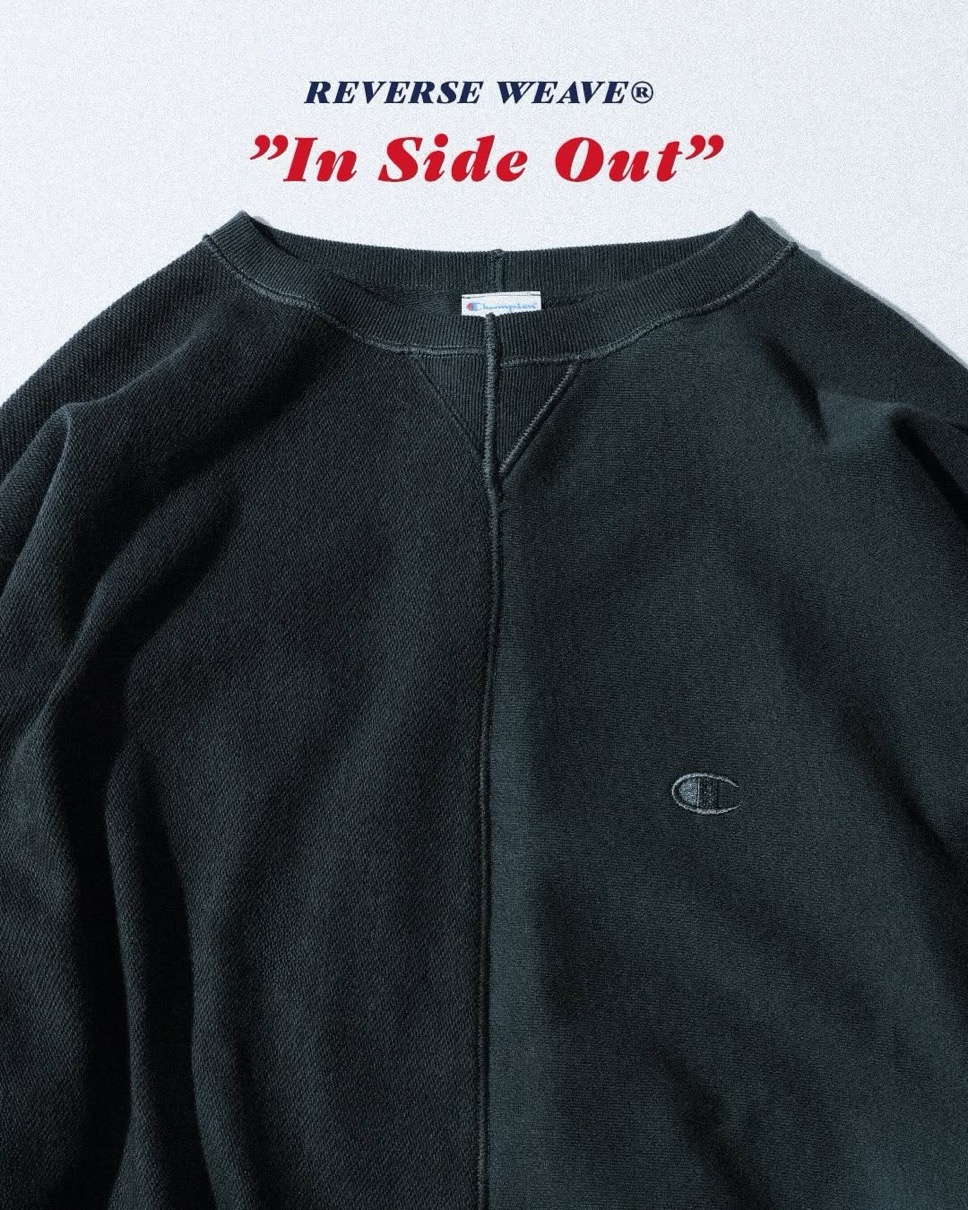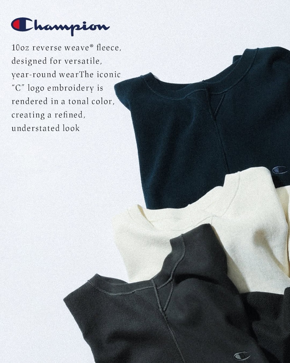 今回の別注の最大の特徴は、「表使い」と「裏使い」を組み合わせた『インサイドアウト』デザイン。本来裏側である部分を意図的に表に出すことで、縫い目の凹凸や生地のコントラストが生まれ、デザインのアクセントに仕上げた。ボディには、柔らかい手触りで着やすいコットン100%の裏毛素材を使用した「REVERSE WEAVE(R) 10oz. French Terry(リバースウィーブ(R) 10オンス フレンチテリー)を採用。特有の横織り生地は、洗濯による縦縮みを軽減し、長年の着用に耐えうるタフな作り。柔らかさと適度な量感による着心地の良さが特長。通常、胸元に配されるChampionのアイコン「Cロゴ刺繍」は、ボディと同色に変更し、さりげなくも確かな存在感を放ちながら、全体のトーンを崩さないミニマルで洗練された印象に仕上げました。大人が着やすい、落ち着きのある雰囲気を演出。