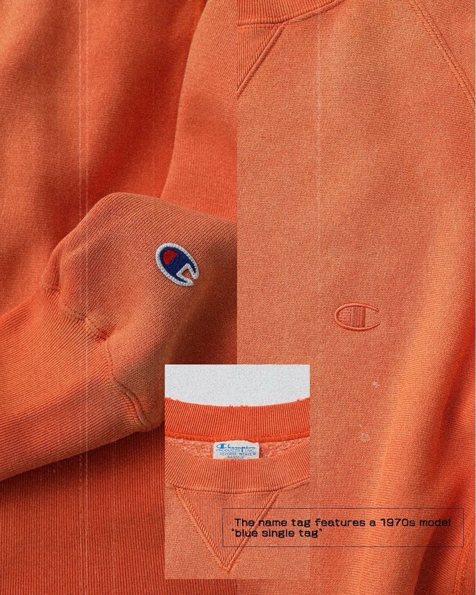 ヴィンテージライクな風合い・Vガゼットとラグランスリーブによる、快適な着心地・丈夫で着心地の良い11.5ozのリバースウィーブ(R)生地を使用25SSでも好評の「チャンピオンリバースウィーブ(R)」スウェットの別注は、ペイントや褪色した「加工感」とラグランスリーブやガゼットなど「ヴィンテージディテール」を詰め込んだ、独特のこなれ感がポイント。