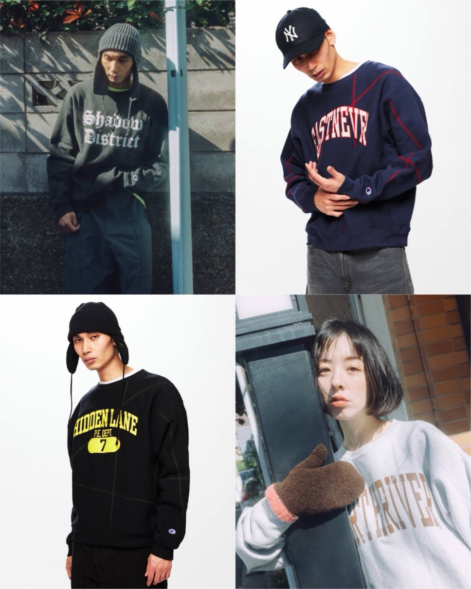今作は、90年代のChampionアーカイブに見られる、地名をプリントしたリバースウィーブがベース。はっきりとした意味を持たず、あえて曖昧でランダムなフレーズを選びプリントすることで、遊び心と脱力感のあるユニークな表情に仕上げている。ボディ全体には、通常のリバースウィーブには見られないステッチを施し、デザインに奥行きとオリジナリティをプラス。タフな素材感と着込むほどに馴染む風合いは伝統のリバースウィーブ製法ならではの仕上がりで、長年愛用できるワードローブに必須の一着となっている。