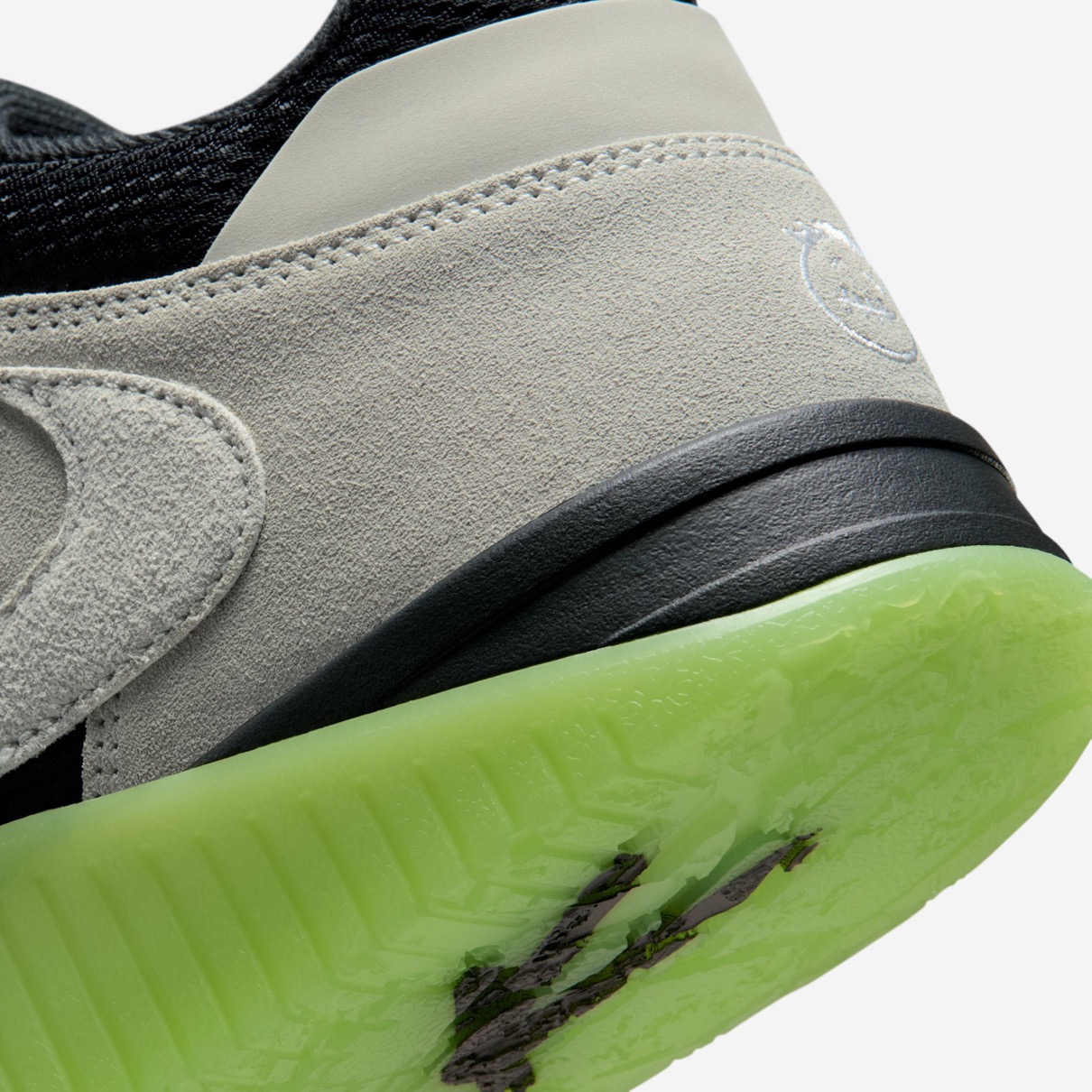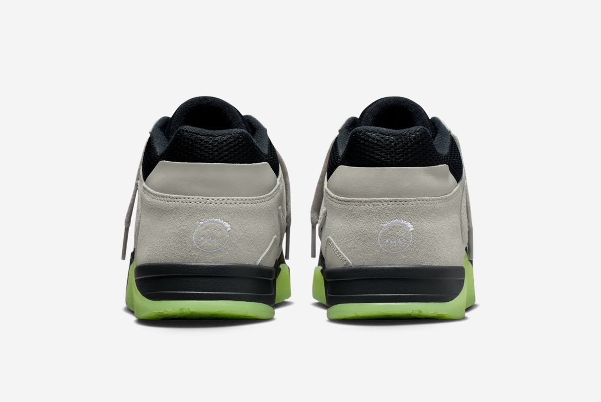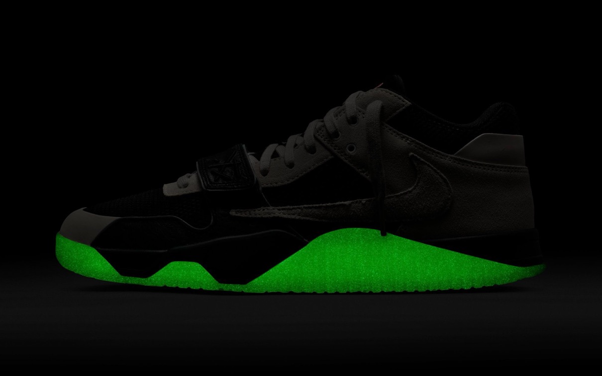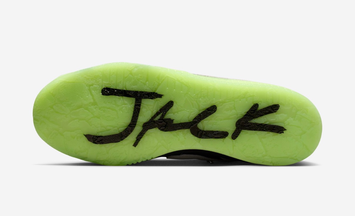 Cactus Jack(カクタスジャック)のアイコンや逆向きのスウッシュロゴが落とし込まれた同コラボは、リリースの度に界隈を賑わす屈指の人気シリーズ。Cactus Jackと契約している Chase B本人が公開したトリプルコラボの『Jordan Jumpman Jack TR(ジョーダン ジャンプマンジャック トレイナー)/CJ1 T-Rexx 』では、チェイスBにインスパイアされた特別なデザインエレメントを特徴としている。ブラックメッシュにナイトシルバーのスウェードオーバーレイを組み合わせ、オーストリッチ調レザーの補強パーツやアンスラサイトのミッドソール、暗闇で光るイリュージョングリーンのGIDアウトソールが特別感を演出し、インソールとアウトソールには“JACK”と“CHASE B”、両者のネームを落とし込んでいる。