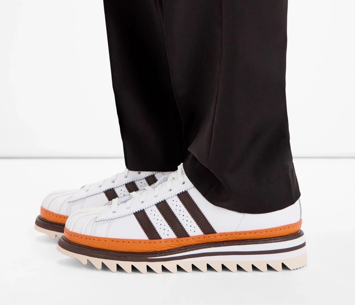 東洋と西洋の架け橋を体現している、adidas Originals x CLOT by Edison Chen コラボコレクション。アディダスを象徴する1970年初登場のアイコンシューズ「スーパースター(SUPERSTAR)」をアレンジしたドレスモデルの新作は、ホワイトのレザーにコーヒーブラウンとオレンジのアクセントを添えた一足。レザーを巻いたシェルトゥと、ドレスシューズを彷彿とさせるソールが高級感を演出している。