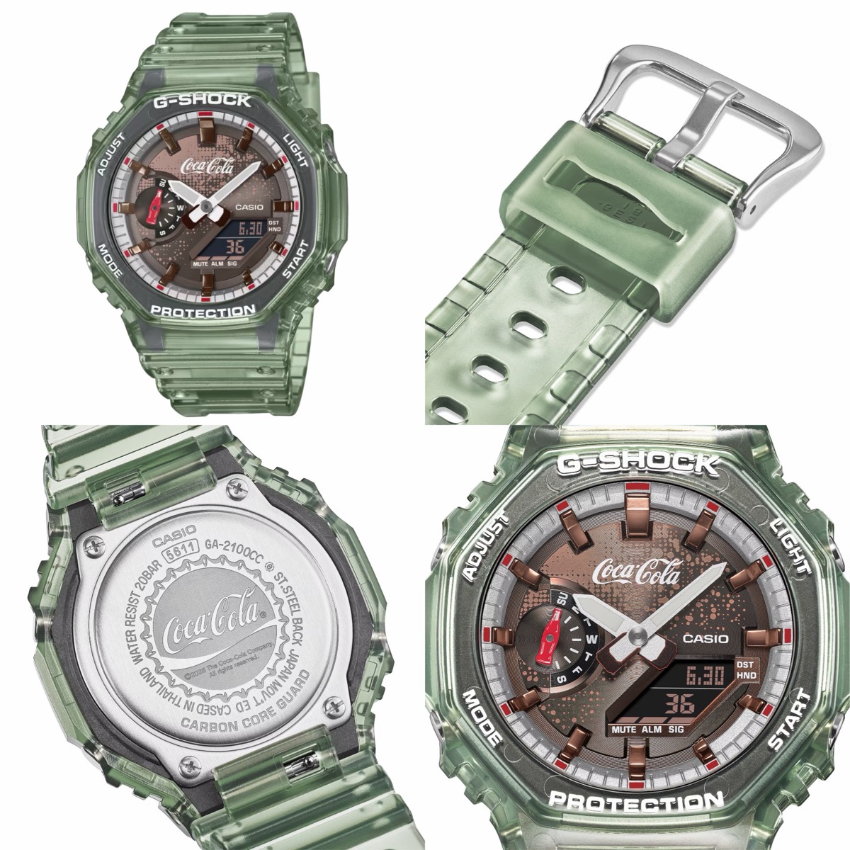 世界中で愛されるコカ・コ―ラ®の140周年を祝した、スペシャル仕様のコラボレーションモデルが登場。ベースモデルには人気のGA-2100を採用。ベゼルとバンドはコカ・コ―ラのアイコニックなコンツアーボトルを想起させるカラーリングとし、ノスタルジックな雰囲気を演出した。曜日を示す9時位置の小針と遊環にはコカ・コ―ラの瓶のモチーフを配し、遊び心あるデザインに仕上げている。コークカラーをイメージしたダイアルには炭酸の泡を表現したプリントを施し、裏蓋には王冠をイメージした刻印をあしらうなど、特別モデルにふさわしい細部までこだわった仕様。本モデルは、コラボレーションを祝う専用パッケージとともに、コカ・コ―ラ140周年を記念する特別仕様でお届けされる。
