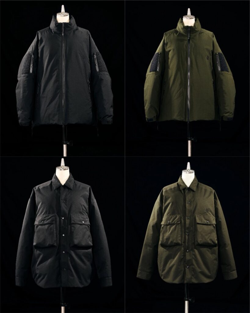 〈Goldwin(ゴールドウイン)〉のオリジナルブランドとの初コラボレーションによるダウンジャケットはミリタリーの本来ソフトシェル素材を使用して作られるジャケットをダウンジャケットにアップデートしたデザイン。両腕のベルクロパネルや襟元の収納式フードなどミリタリージャケットならではの本格的なディテールが特徴で、素材には耐久性・防水性に優れたナイロンタフタGORE-TEXが使用されており、デザインに機能性もプラスされたコラボレーションならではの一着。また、表地に防風性と透湿性を兼ね備える「WINDSTOPPER® プロダクト by GORE-TEXLABS」を使用したダウンシャツもラインナップし、カラーはいずれもブラックとカーキの2色が展開する。
