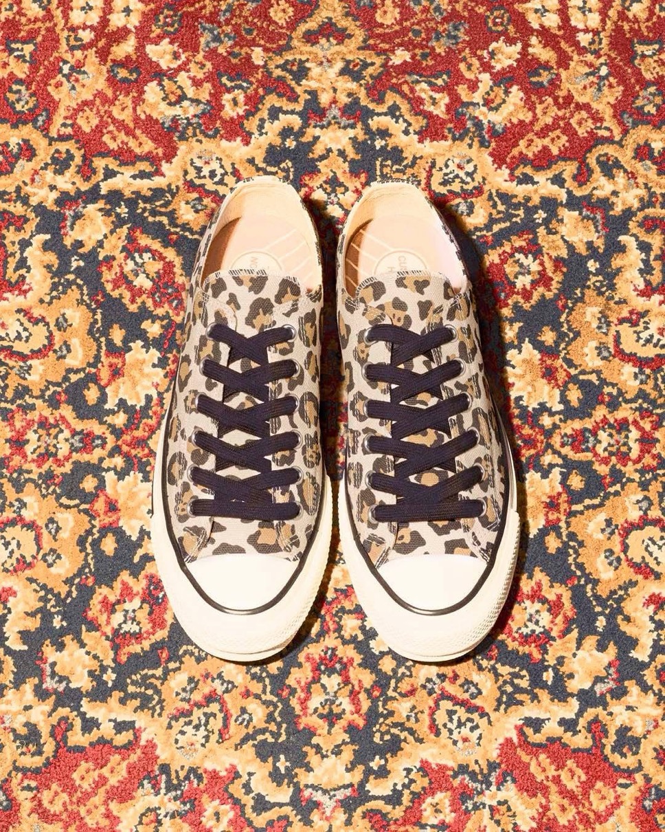 二足目のチャックテイラー マテリアルでは、1987年に登場した「GLOW IN DARK」シリーズよりレパード柄を採用。1960年代のALL STARに見られる三ツ星ヒールラベルやサイドステッチ、ソールの糊のはみ出しなど当時のディテールを再現。クッション性に優れたE.V.A.と「PORON®」の2重構造に加え、安定した歩行をサポートするTPUシャンクを組み合わせたカップインソール、防滑性と耐摩耗性に優れ全天候に対応した「HIGH PERFORMANCE RUBBER COMPOUND」の「VIBRAM® MEGAGRIP」ソールなど、ハイスペックな機能を搭載し快適な履き心地を実現。ホワイトのスペアシューレースが付属する。