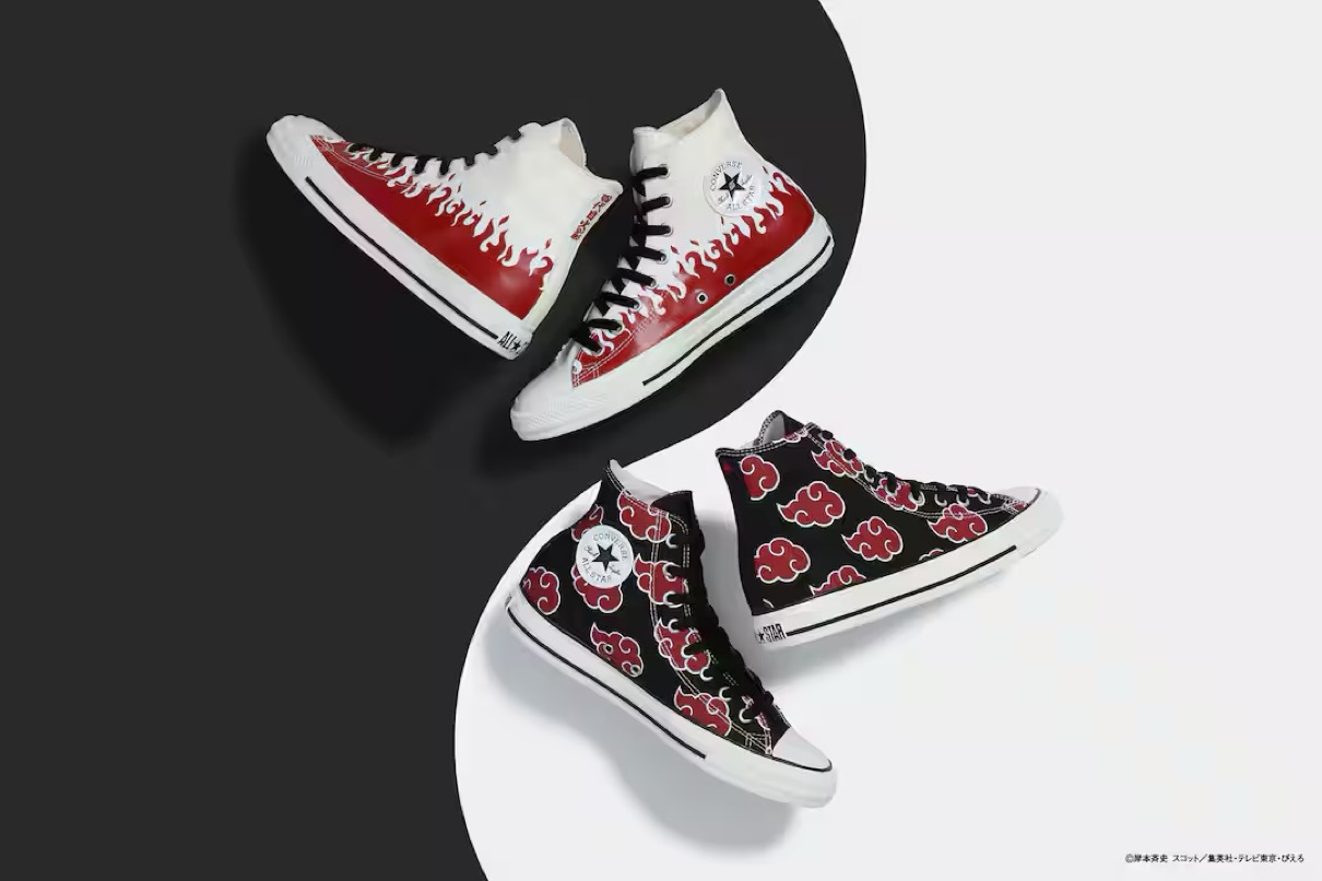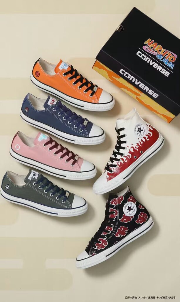コンバースを象徴する『All Star(オールスター)』に主要キャラクター6人をモチーフにしたファン垂涎のスニーカーが誕生。ローカット(OX)はうずまき ナルト、うちは サスケ、春野 サクラ、はたけ カカシの4人をイメージしており、踵部分に各キャラクターの一族の家紋を刺繍で施したり、主人公たちが暮らす「木の葉隠れの里」のハチ金(額当て)をイメージしたオリジナルのデュブレを付属したスペシャルなデザイン。(デュブレのマーク…ナルト・サスケ・サクラ:「木の葉隠れの里」のマーク、サスケ:傷がついた抜け忍仕様の「木の葉隠れの里」のマーク)
