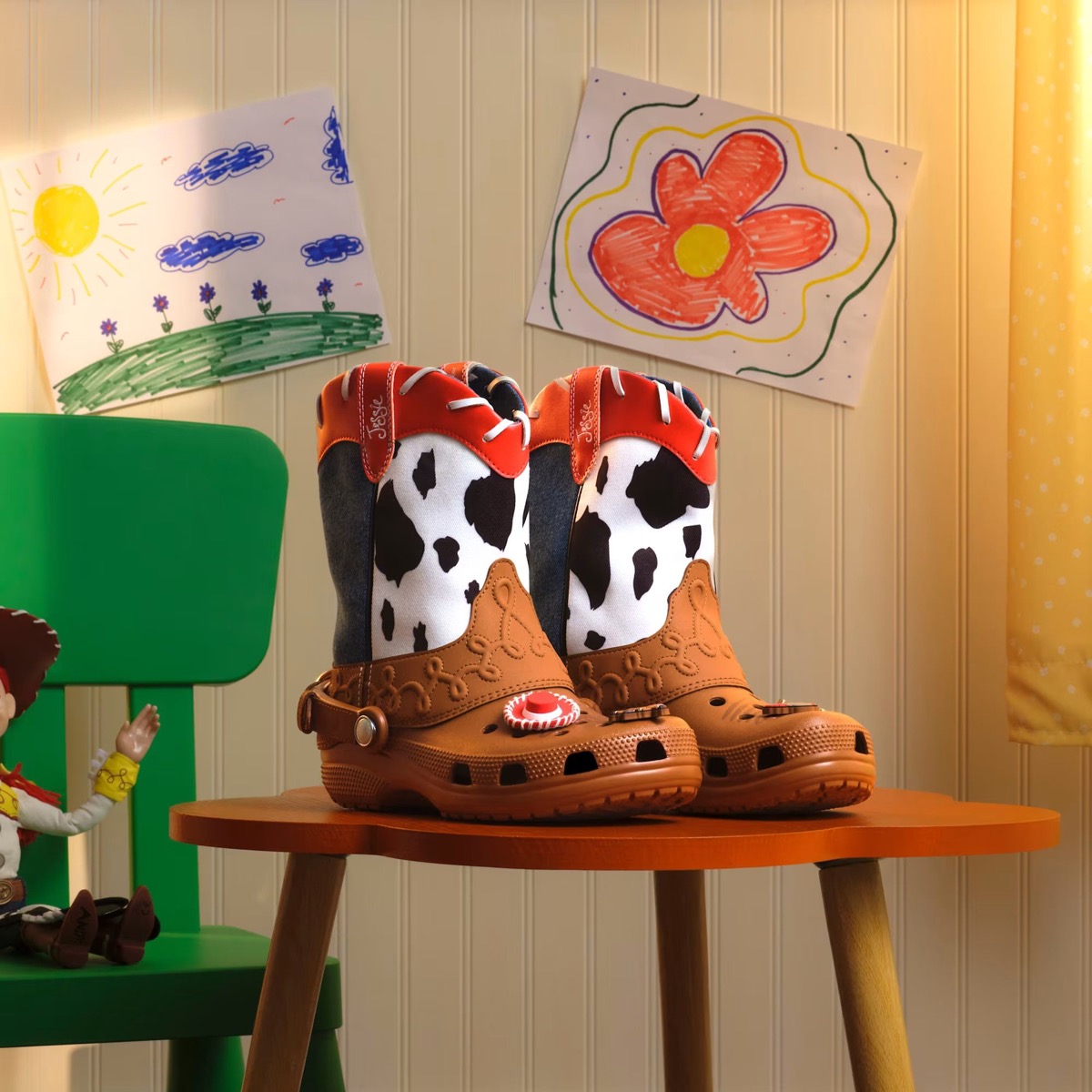 クロックスの「ジェシー・ブーツ」は、「風のように駆け抜ける」ことをコンセプトにデザインされており、標準的なクラシック・クロッグとは異なるハイカット仕様のカバーが、カウガールも認めるスタイルを演出。デニムのアクセントと牛柄のカラーがシャフトを彩り、甲部分には本格的なウエスタンウェア風の刺繍が施されている。ジェシーのスタイルを際立たせるその他のディテールには、バックストラップとゴールドのメタリックバックル、ブーツの開口部を囲む「Jessie」の刺繍、そして「Sheriff」と書かれた星形のジビッツ™チャームがある。