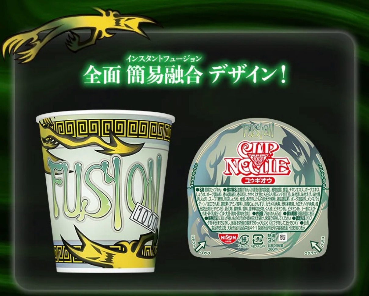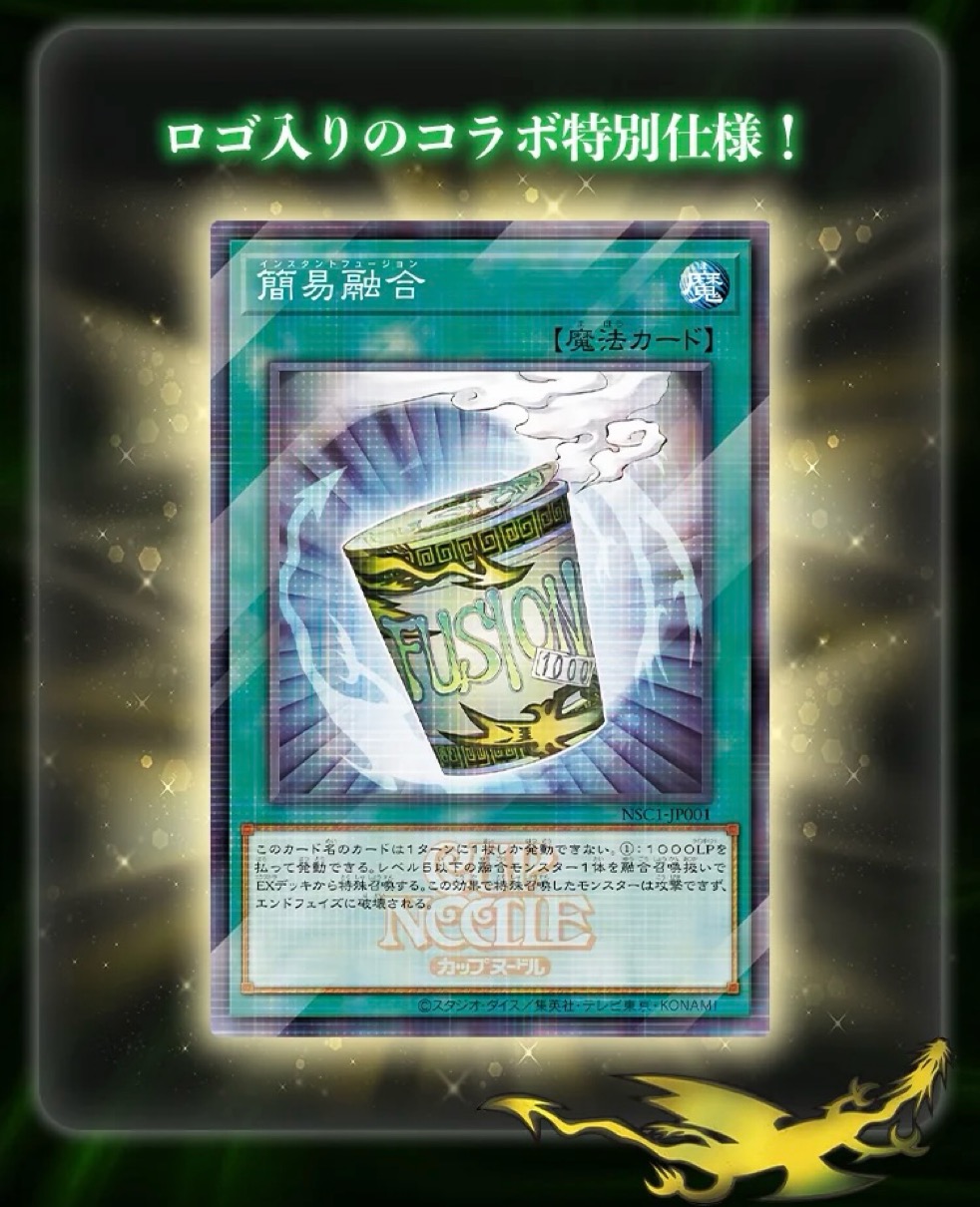アニメ遊★戯★王シリーズ25周年と カップヌードル55周年を記念して生まれた本商品は『遊戯王OCG』に登場する魔法カード「簡易融合」に描かれているカップ麺を再現した限定デザインの「カップヌードル」と、「カップヌードル」のロゴが入った特別なコラボカード「簡易融合」の限定セット。※「遊戯王OCG カップヌードル 簡易融合」の中身は、通常の「カップヌードル」と同じ。