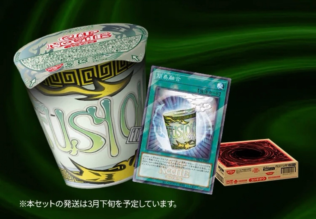 日清食品が1971年から発売しているカップ麺「カップヌードル(Cup Noodle)」と、日本の名作漫画・トレーディングカードゲーム・アニメ『遊☆戯☆王(ゆうぎおう,Yu-Gi-Oh!)』によるコラボ「遊戯王OCGカップヌードル 簡易融合 20食入り コラボカード付き限定セット」が、国内2026年3月18日(水)正午に日清食品オンライン商品ページで発売される。