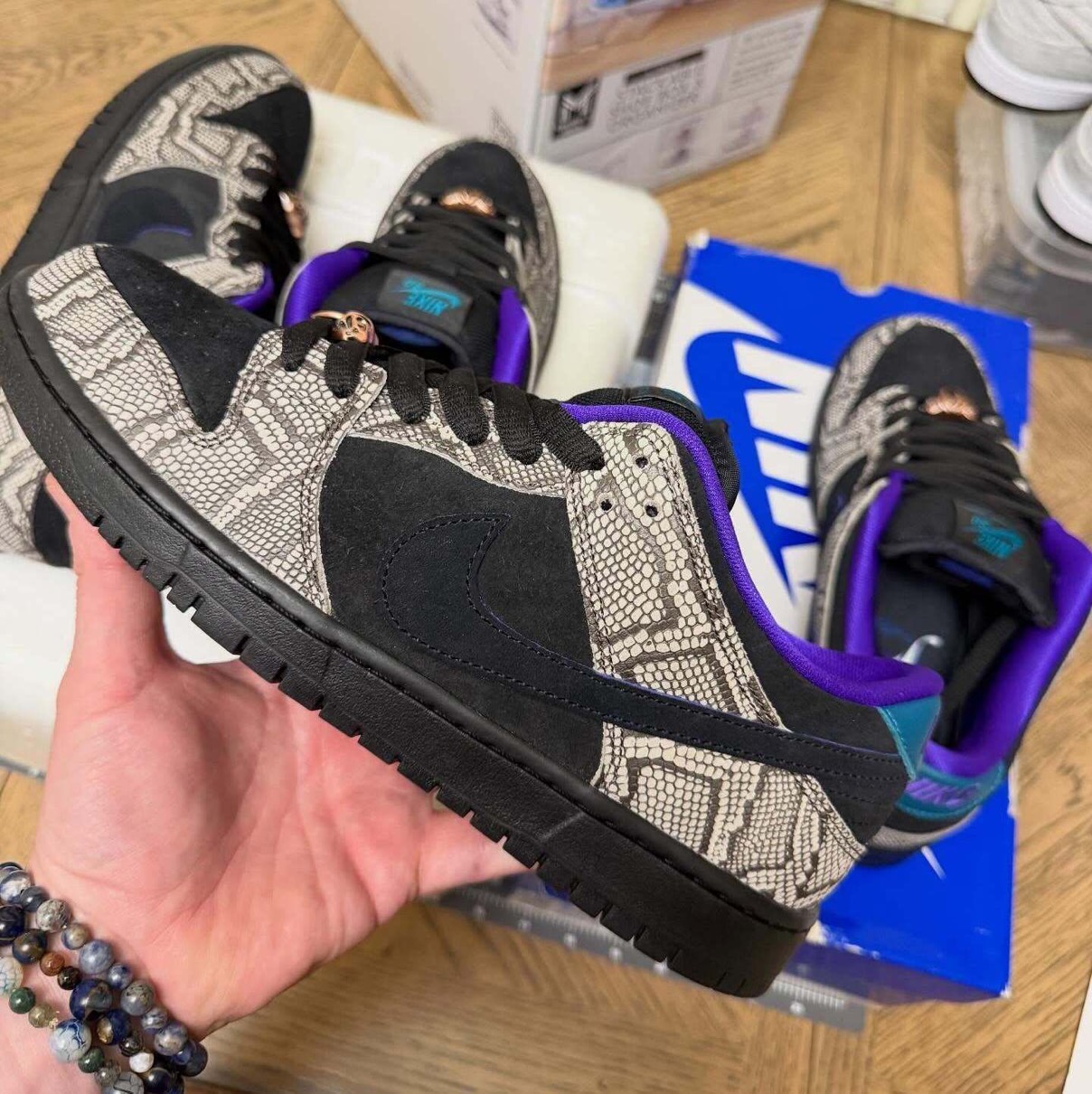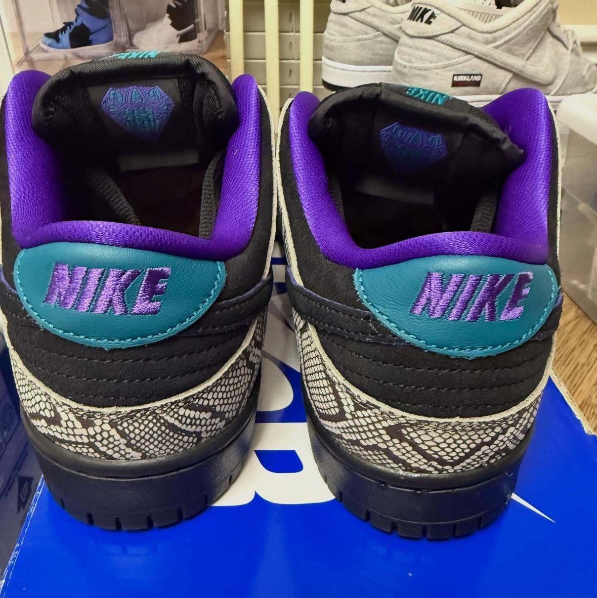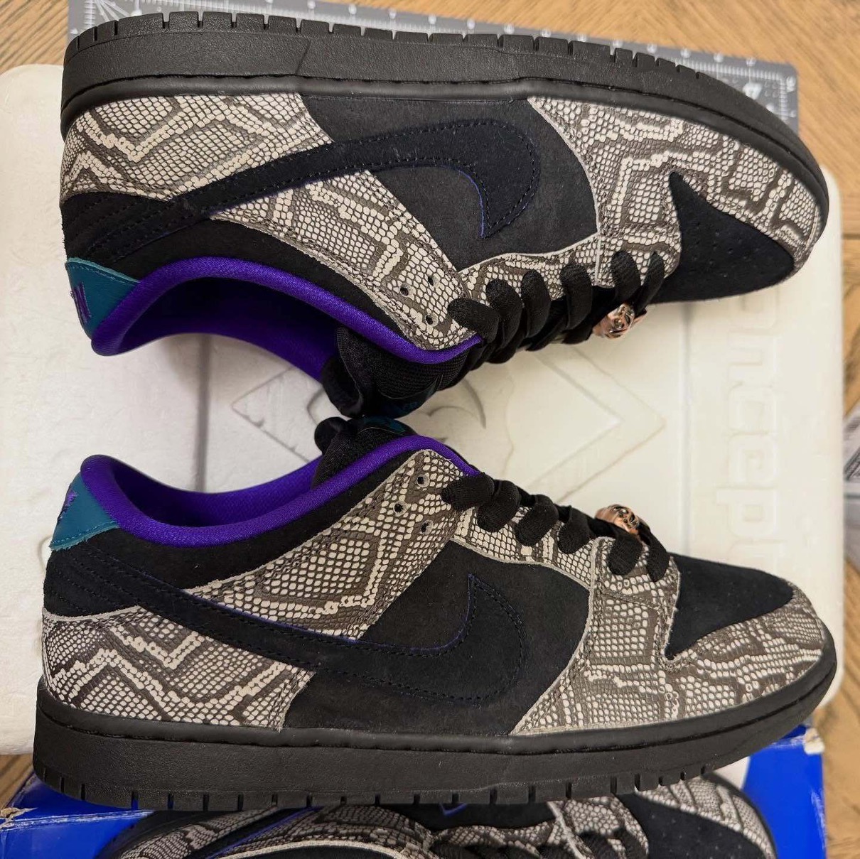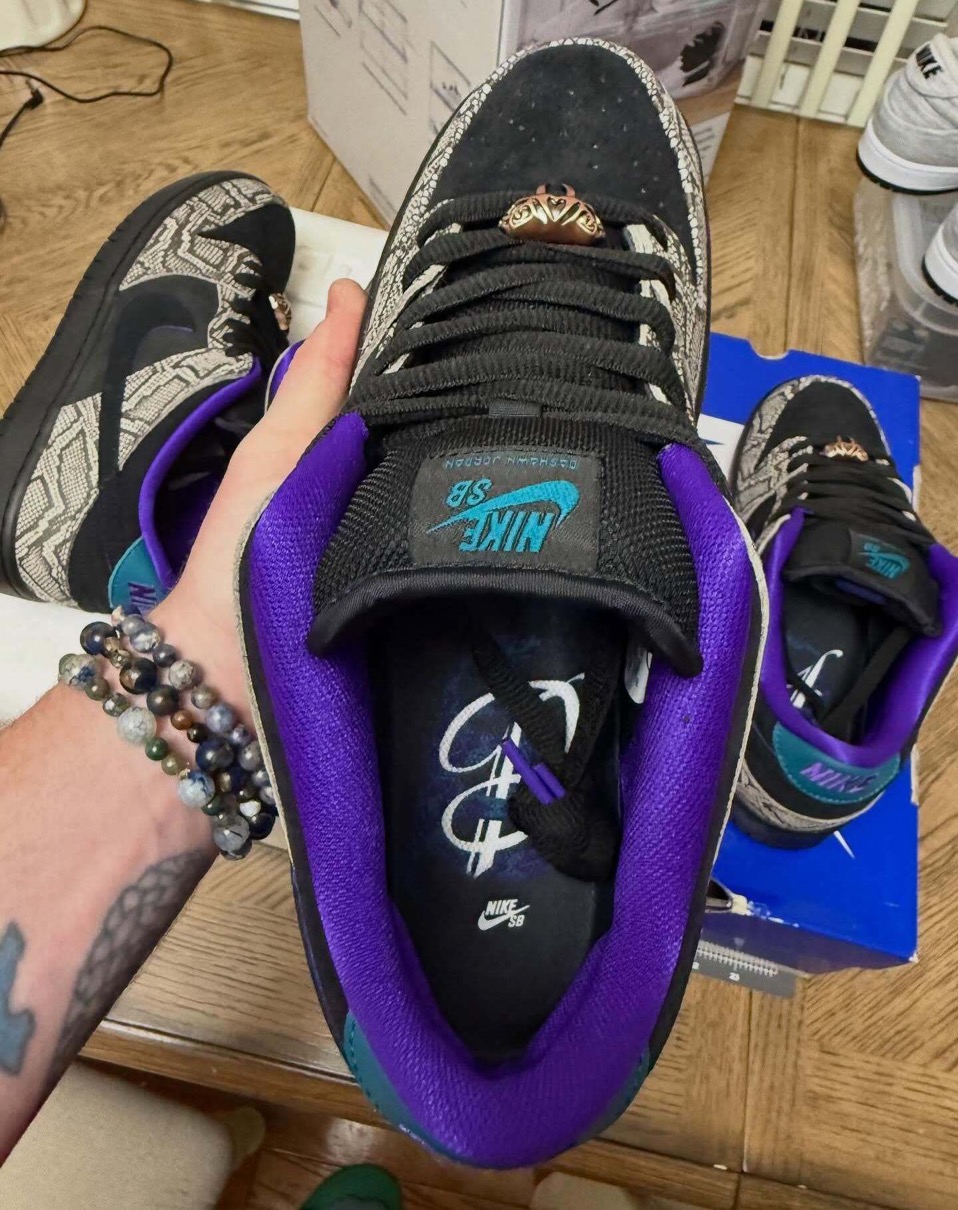 今作でベースとなるのは、ナイキの人気スニーカー「ダンク(Dunk)」のSBローカットモデル。ダショーン・ジョーダンのルーツであるアリゾナにインスパイアされたこのシューズは、ワイルドな質感とプレミアムな雰囲気が融合している。ブラックのスエードパネルに、アリゾナに生息するガラガラヘビをイメージしたスネーク柄オーバーレイが組み合わされ、ライナーにはフィアースパープル、ヒールパッチとシュータンタグのロゴにはブルーのアクセントが落とし込まれている。