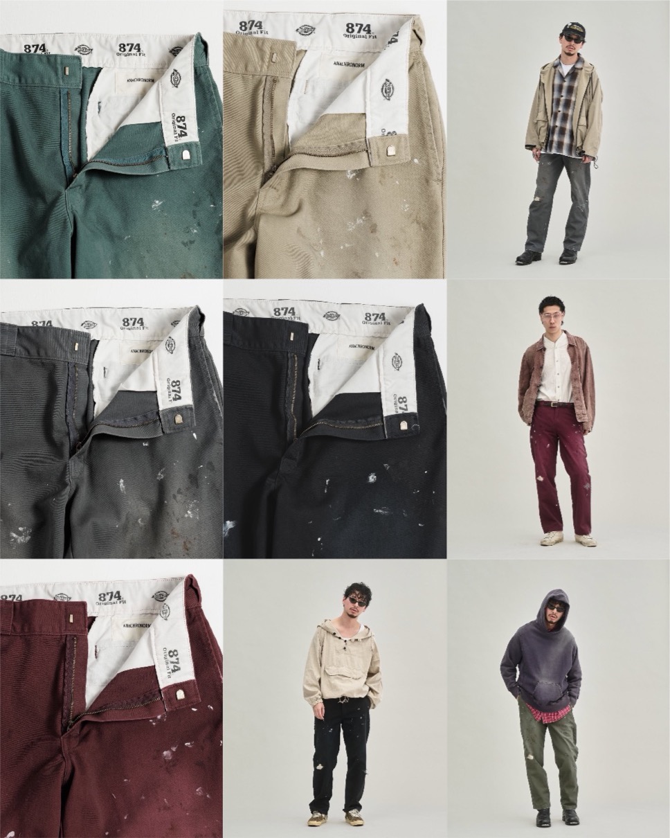 今回のコラボで登場するのは、そのタフさゆえに、加工による風合いを生み出すのが困難ともいわれる、Dickies®︎のアイコンともいえる“874®︎ワークパンツ”を元に、ANACHRONORMの独自領域とも言える加工技術によって長年履き込んだかのようなリアルなエイジングとリペアを落とし込んだ一本。刻まれた痕跡は、単なる経年ではなく、意図された“記憶”。