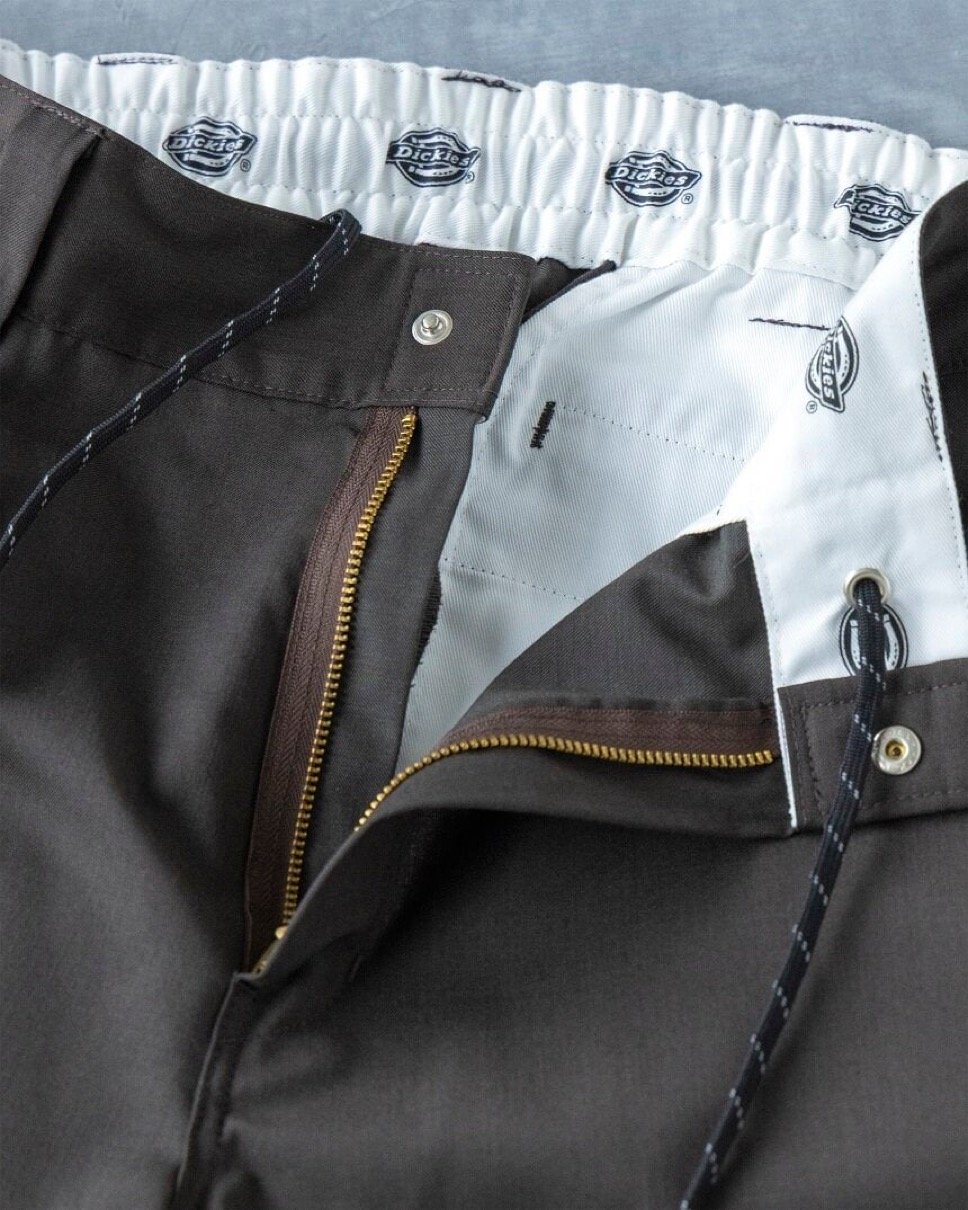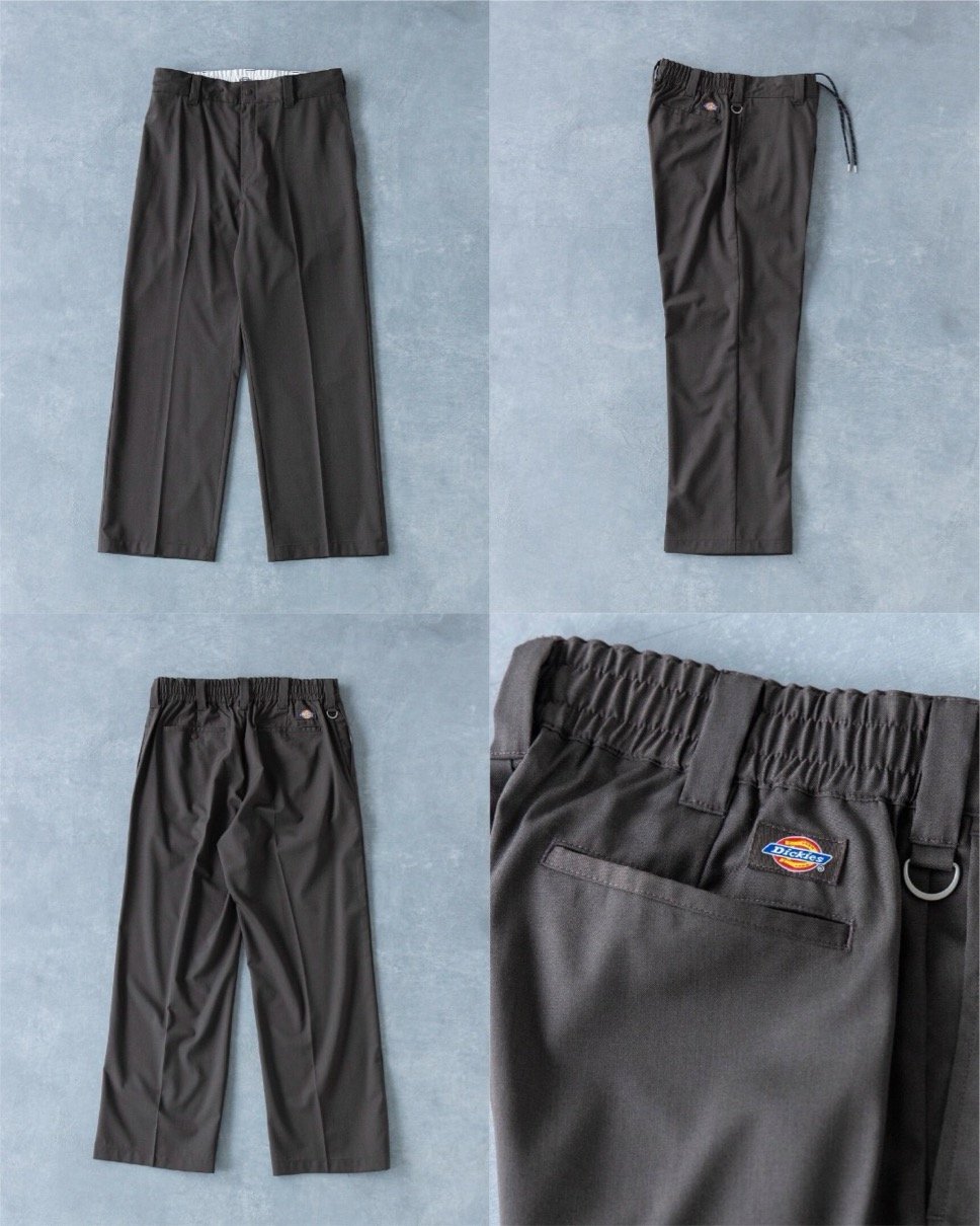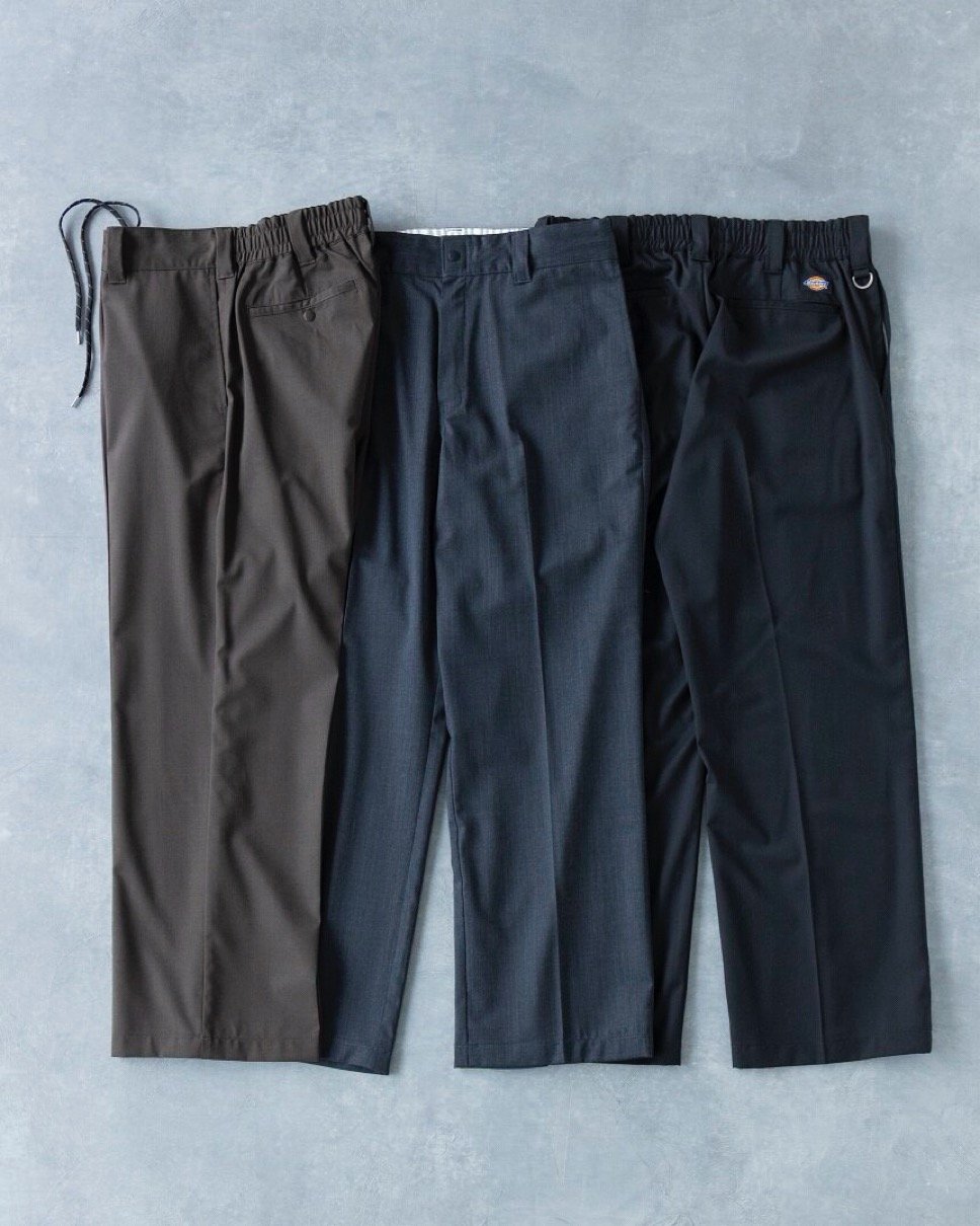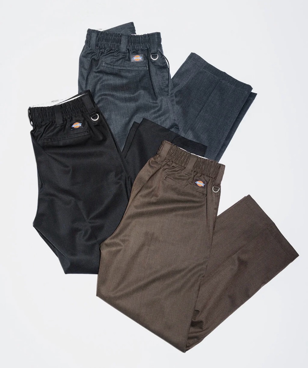 Dickies®の定番モデル「875」をベースにシルエット調整し、メリノウールとストレッチ性に優れた帝人フロンティア社の「SOLOTEX」とUNIFI社の「REPREVE」リサイクルポリエステルを混紡したウールを採用。ウール素材特有のしなやかさとドライでソフトなタッチが特徴で、ウエストの後ろ部分にゴムを入れたスピンドル仕様、フロントトップボタンとヒップポケットはスナップボタンに、ベルトループにはDカンを配置。ドライな生地感による快適さとベルトレスでも穿けるイージーな穿き心地に拘っている。カラーはブラック、ダークグレー、ダークブラウンの3色が展開する。