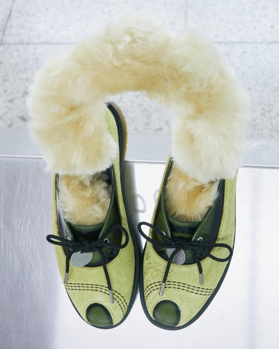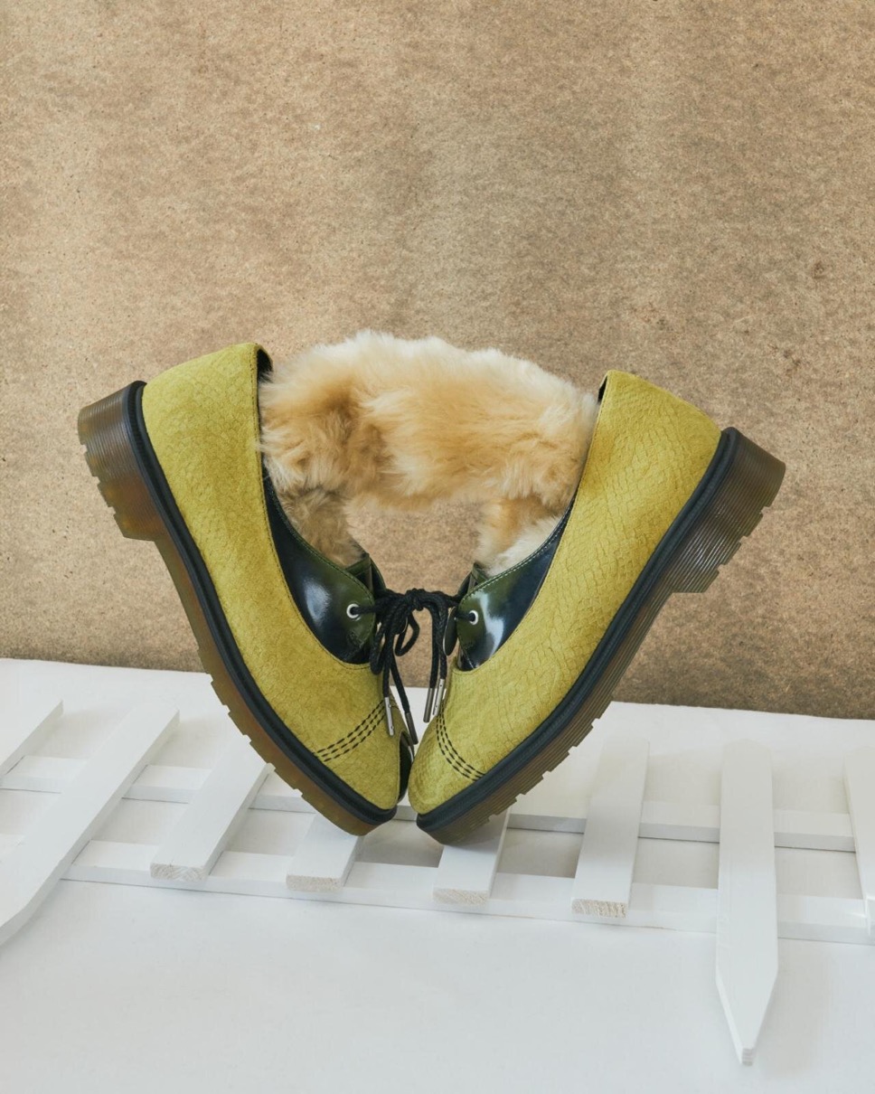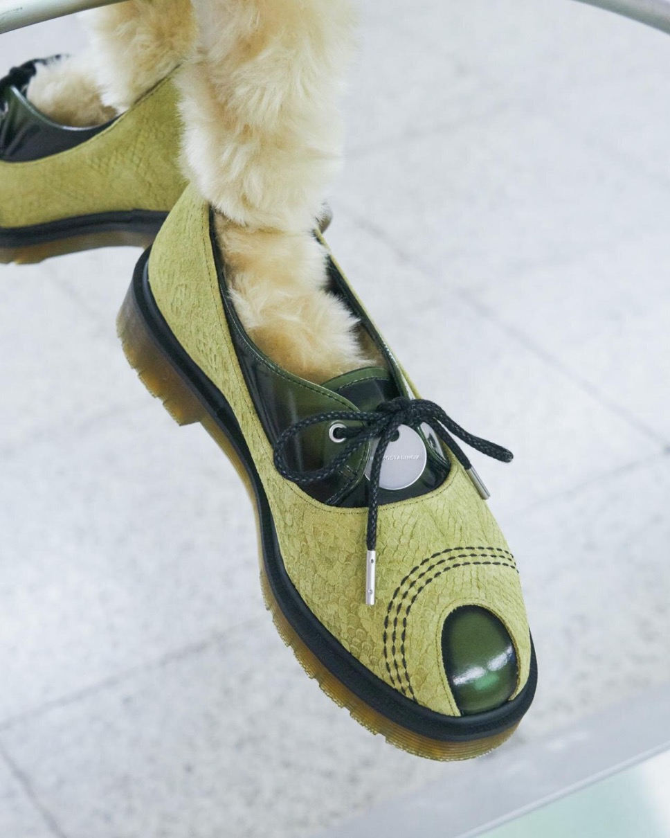 レディース用「TOE BOX SHOE」は、エンボス加工を施したシャルトリューズ色のスエードとツートーンのグリーンレザーをアッパーに使用した1アイレットのレースアップシューズ。クラシックなオックスフォードシューズにメアリージェーンのシルエットを取り入れたこのハイブリッドなデザインは、カットアウト構造、3色のコントラストステッチのディテール、そしてKiko Kostadinov Women’sのドッグタグが特徴。本モデルは、耐久性に優れたレザー、丸みを帯びたトゥボックス、グッドイヤーウェルト製法、溝付きのエアクッションソールなど、ドクターマーチンのオリジナル要素を採用している。