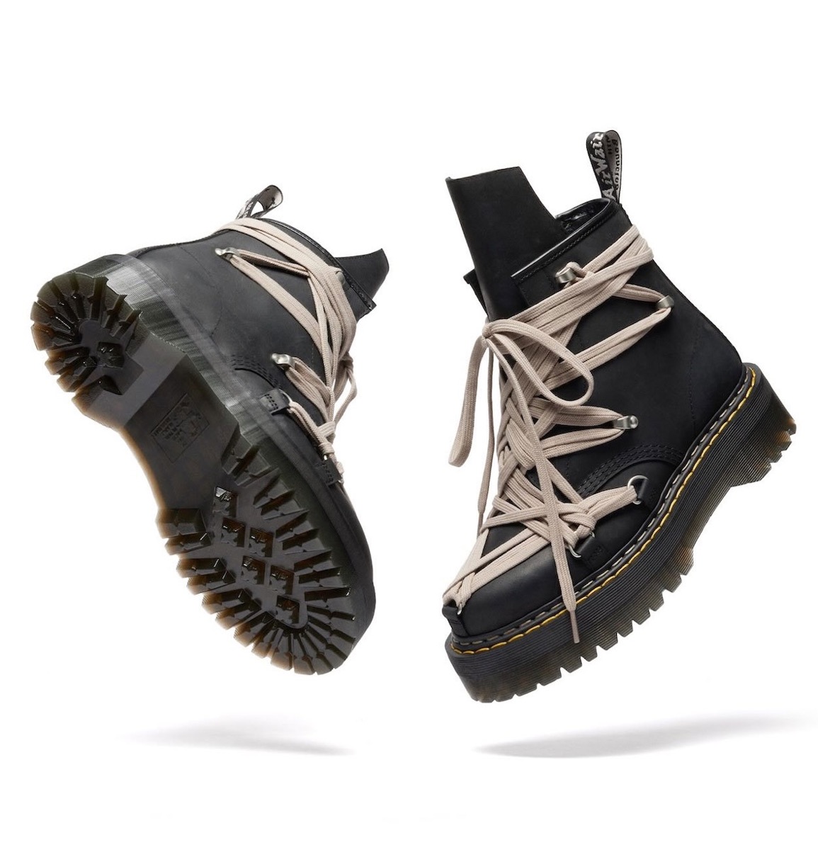 リック・オウエンスのシグネチャーであるメガレースシステムを落とし込んだ1460 QUAD SOLE MEGALACE BOOTは、超ロング仕様のシューレースで、象徴的な“ペンタグラム(五芒星)”モチーフを表現するようにしてあしらわれている。