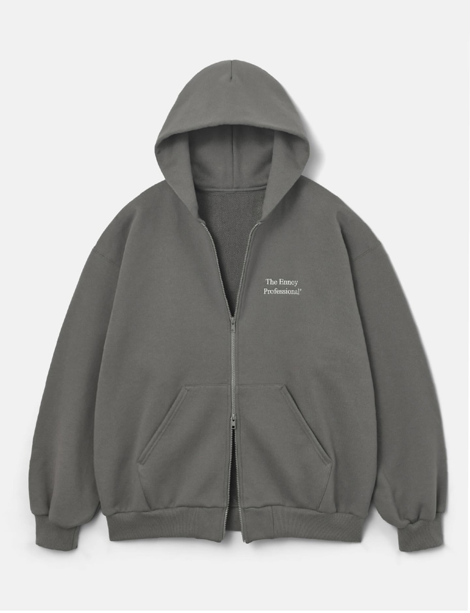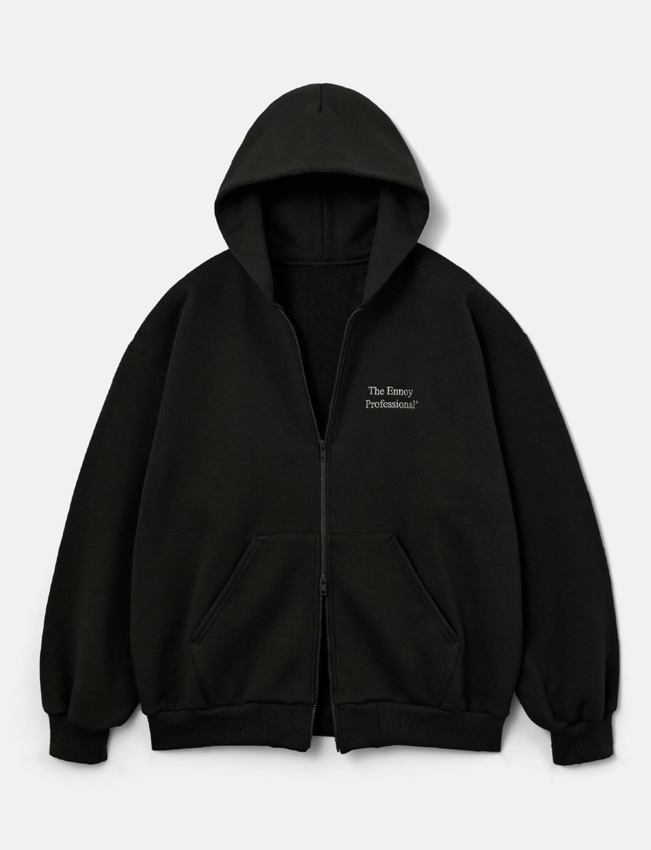 ダブルジップのコットン100%スウェットフーディが登場。左胸にはThe Ennoy Professional®ロゴ刺繍が配され、カラーはブラックとチャコールグレー、ネイビーの三色が展開。カンガルーポケットが付いたセットインスリーブのジップアップスウェットフーディーはダブルファスナー仕様で、ほどよく裾リブを絞ったリラックスシルエット。しっかりと目が詰まったヘビーウェイトコットンは洗っても型崩れしにくく、それでいて肌触りの良い裏パイル地を用いることでオールシーズン着用できるアイテムに仕上がっている。