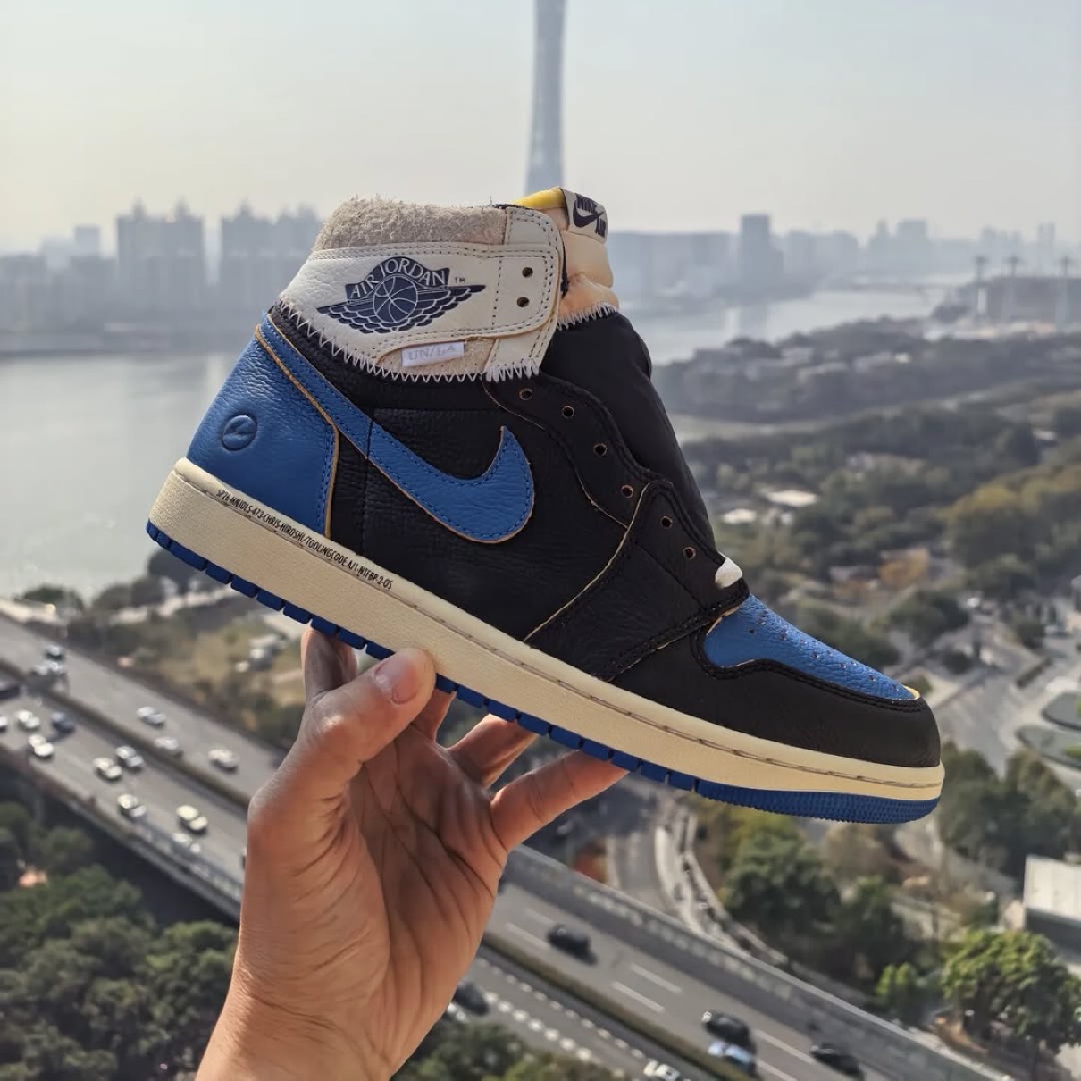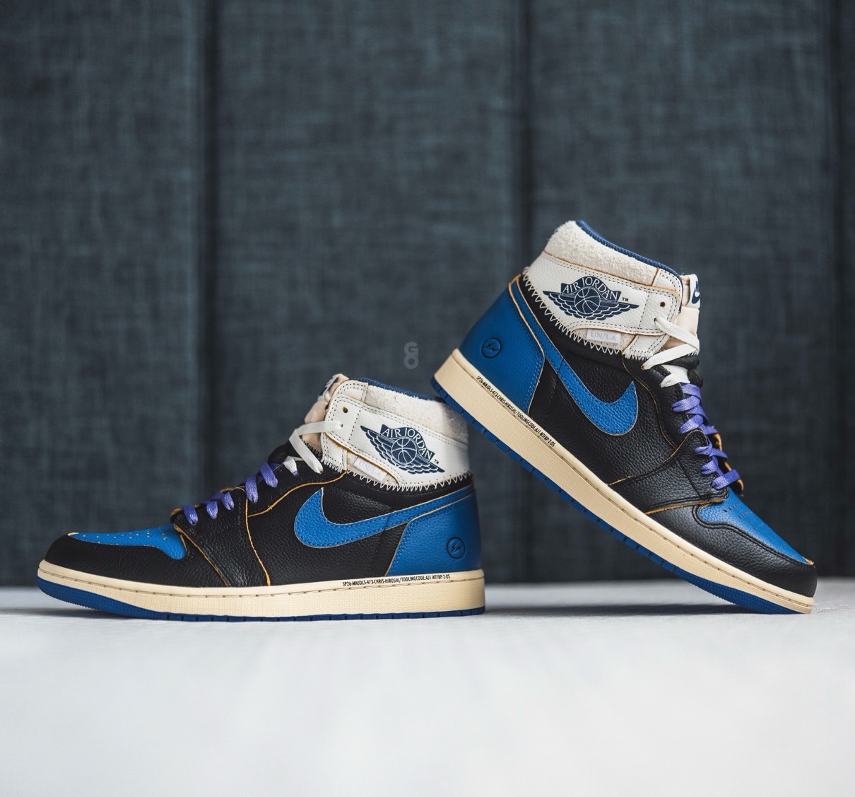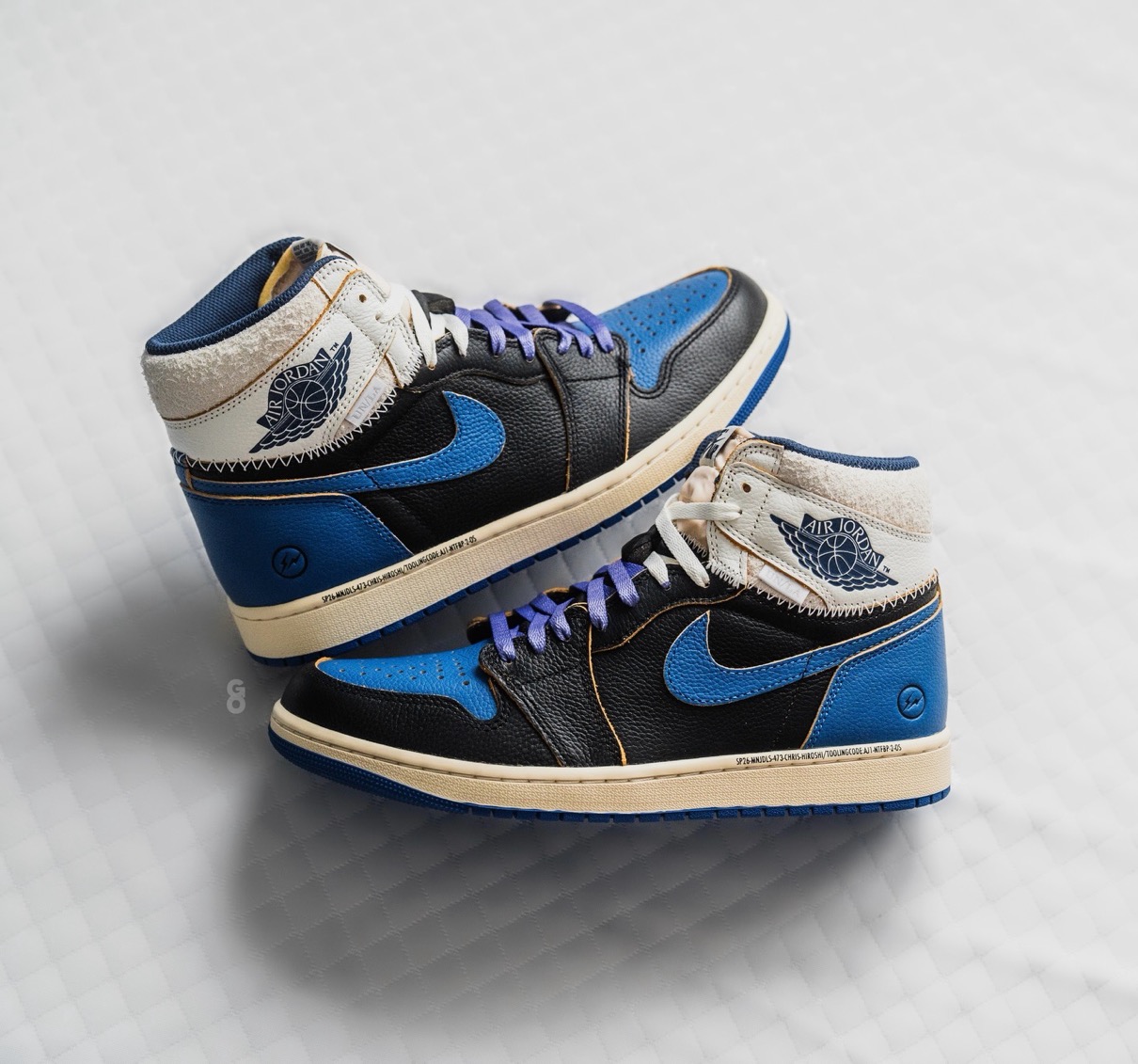 フラグメント x ユニオン x ナイキ ジョーダンブランド 黒青カラーのトリプルコラボスニーカー AJ1(エアジョーダン1) レトロ ハイ オージー エスピー “ブラック&スポーツロイヤル”が登場。[IO7847-001]