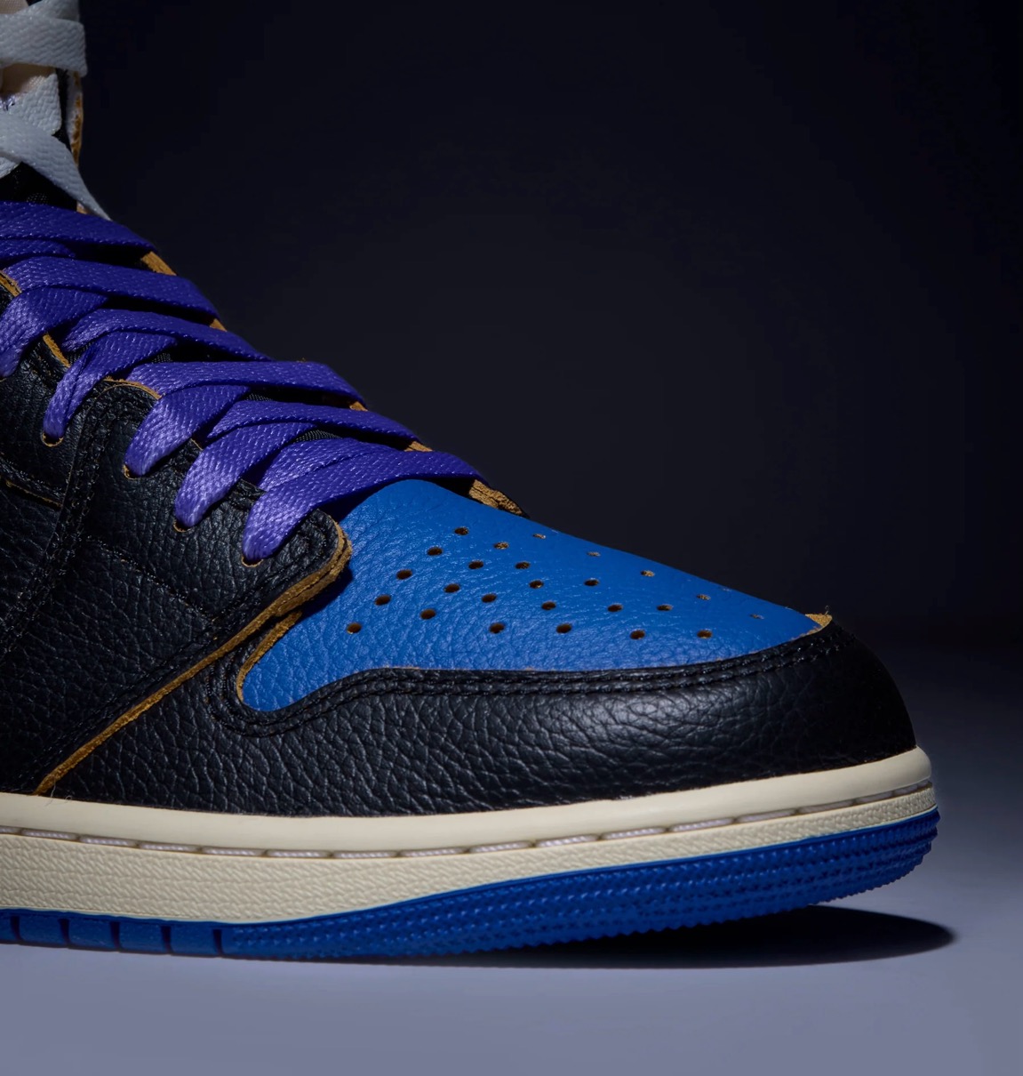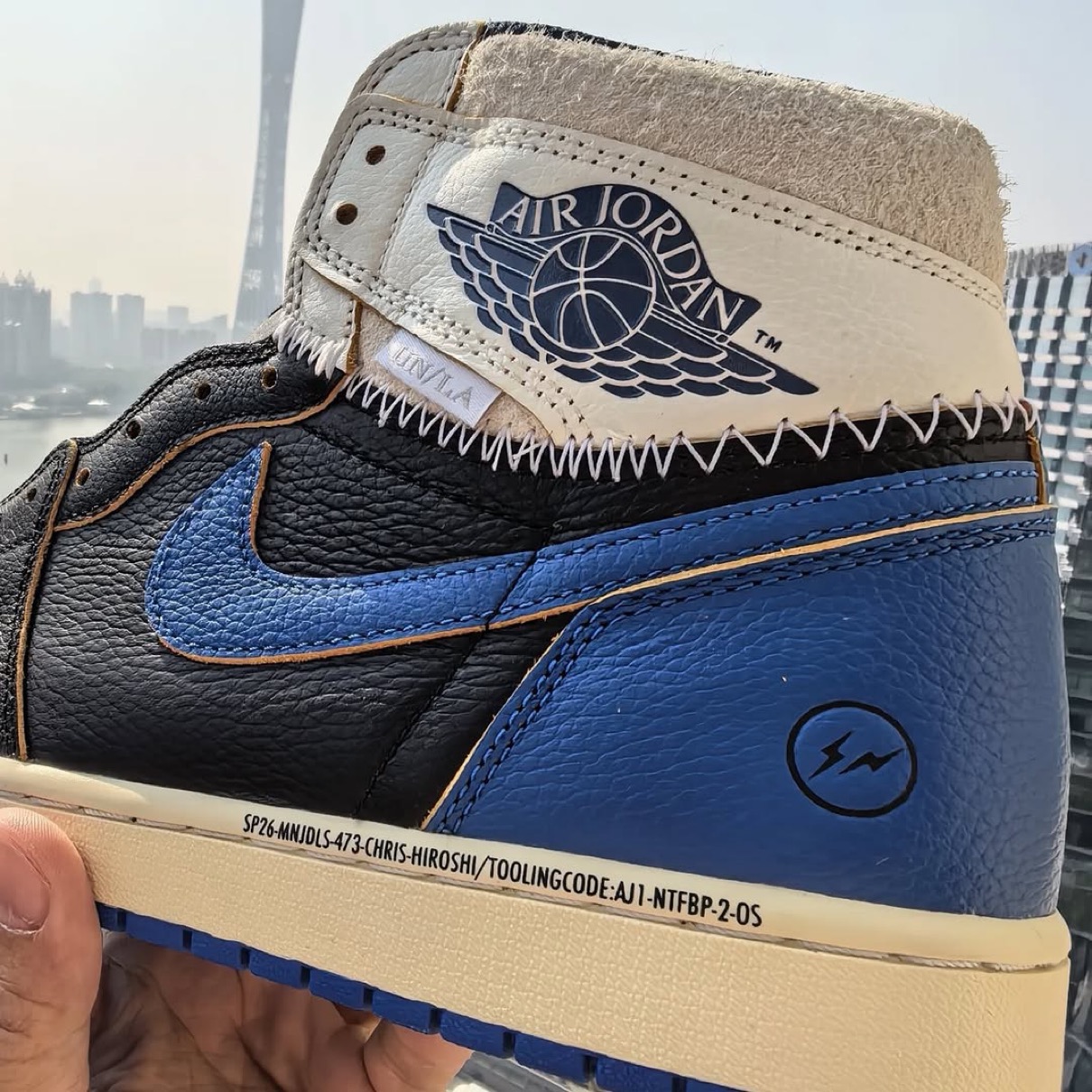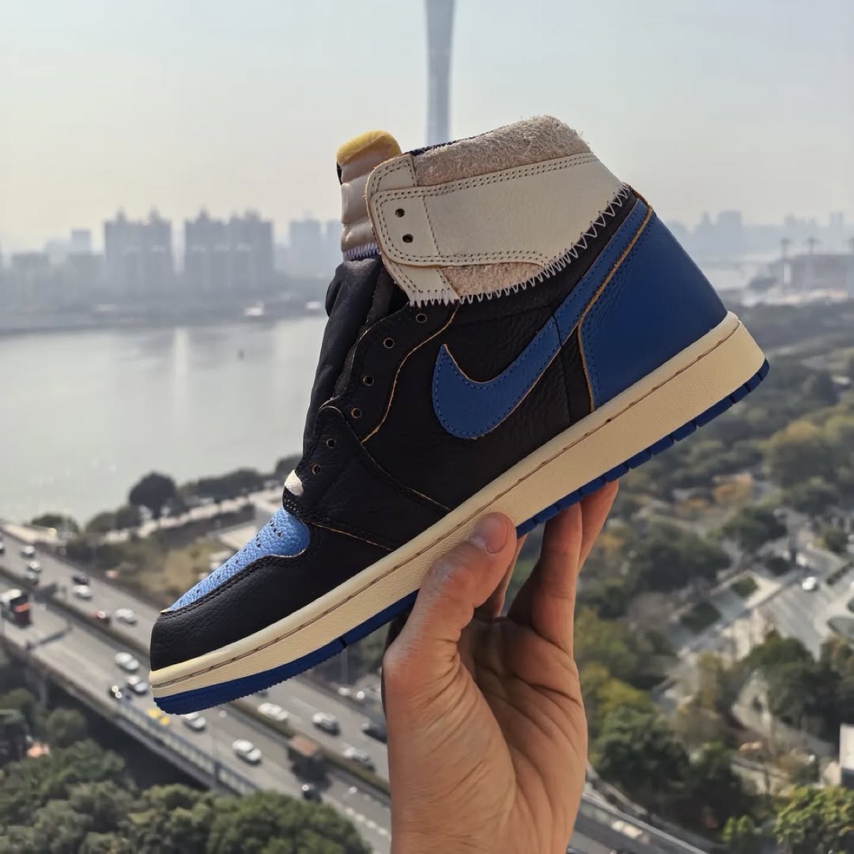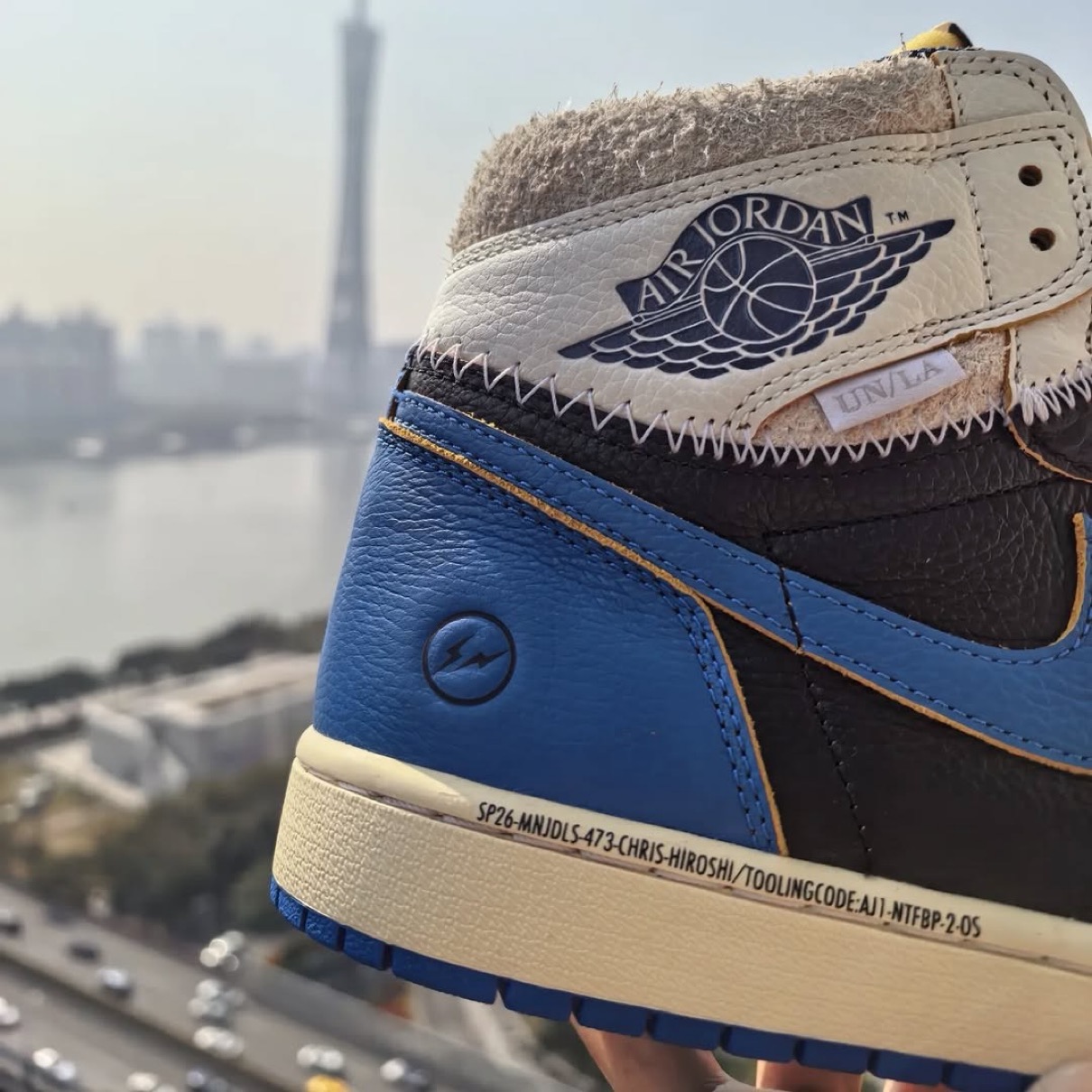 フラグメント x ユニオン x ナイキ ジョーダンブランド 黒青カラーのトリプルコラボスニーカー AJ1(エアジョーダン1) レトロ ハイ オージー エスピー “ブラック&スポーツロイヤル”が登場。[IO7847-001]