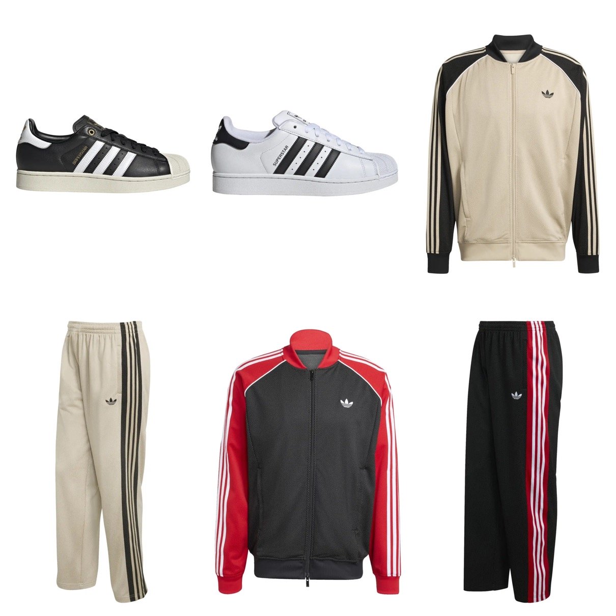 これまでの伝統を継承しながら再構築された「SUPERSTAR」は、オーセンティシティを体現するアイコンとして、今なおパワフルでアイコニックな存在感を強めている。2026年春シーズンには、アパレルのトーンや素材感をさりげなく刷新し、「SUPERSTAR」のスタイリングをアップデート。ノスタルジックなスタイルに最新のテーラリングを掛け合わせ、すっきりと洗練されたシルエットを提案します。さらにクラシックなブラック&ホワイトを基調に、目を引く印象的なレッドのアクセントを加えることで、力強いコントラストを生み出している。メンズでは、アディダスを象徴するスリーストライプスをあしらい、ゆったりとしたシルエットにレッド、ブラック、ホワイトのカラーブロックで仕上げたトラックスーツを展開。さらに定番になりつつあるデニムをはじめ、ニュートラルカラーの T シャツやジャカード ジャージーなどをラインナップ。