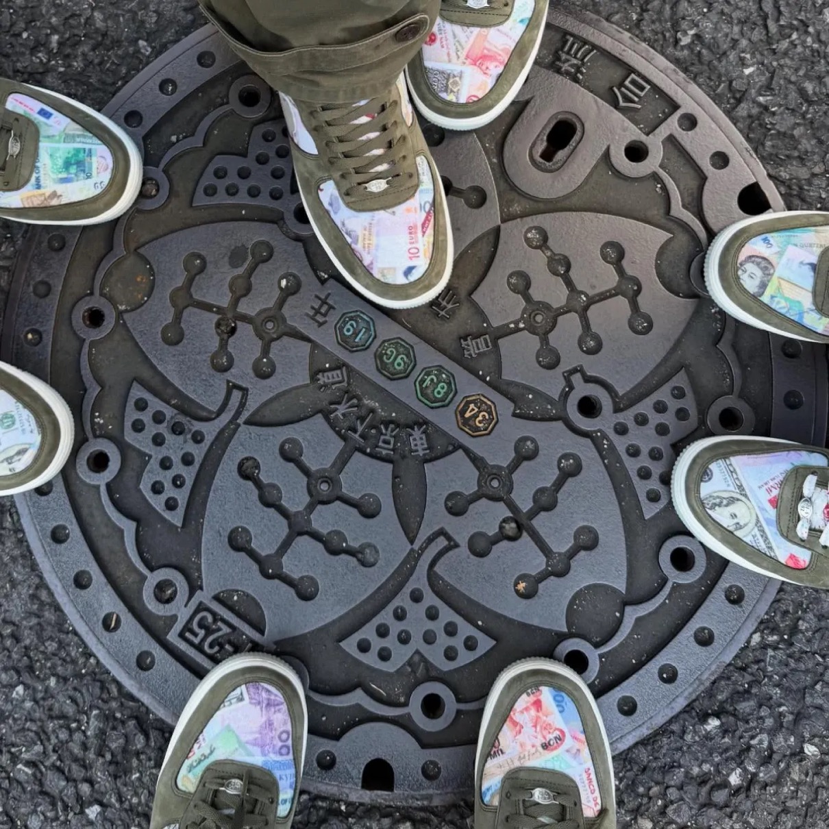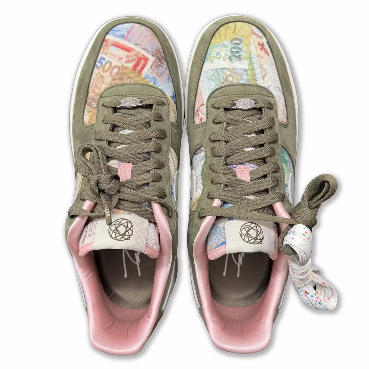 今や有名なスニーカー全面の紙幣プリントは、意図的に設計された緊張感の源だった。比喩と示唆を込めた表現であると同時に、映画で有名な賞金稼ぎが使う頭字語をもじった遊びでもある。スニーカーのデザインプロセスから、文字通り、そして比喩的に、靴の生地に力強い問いが刻まれた。フューチュラの友人たちは靴を「愛のために(FOR LOVE)」手元に置き、友情がお金より大切だと示すのか?それとも人間の衝動である「それともお金(OR MONEY)」が勝り、短期的な金銭的利益のために転売されるのか?というメッセージが込められている。