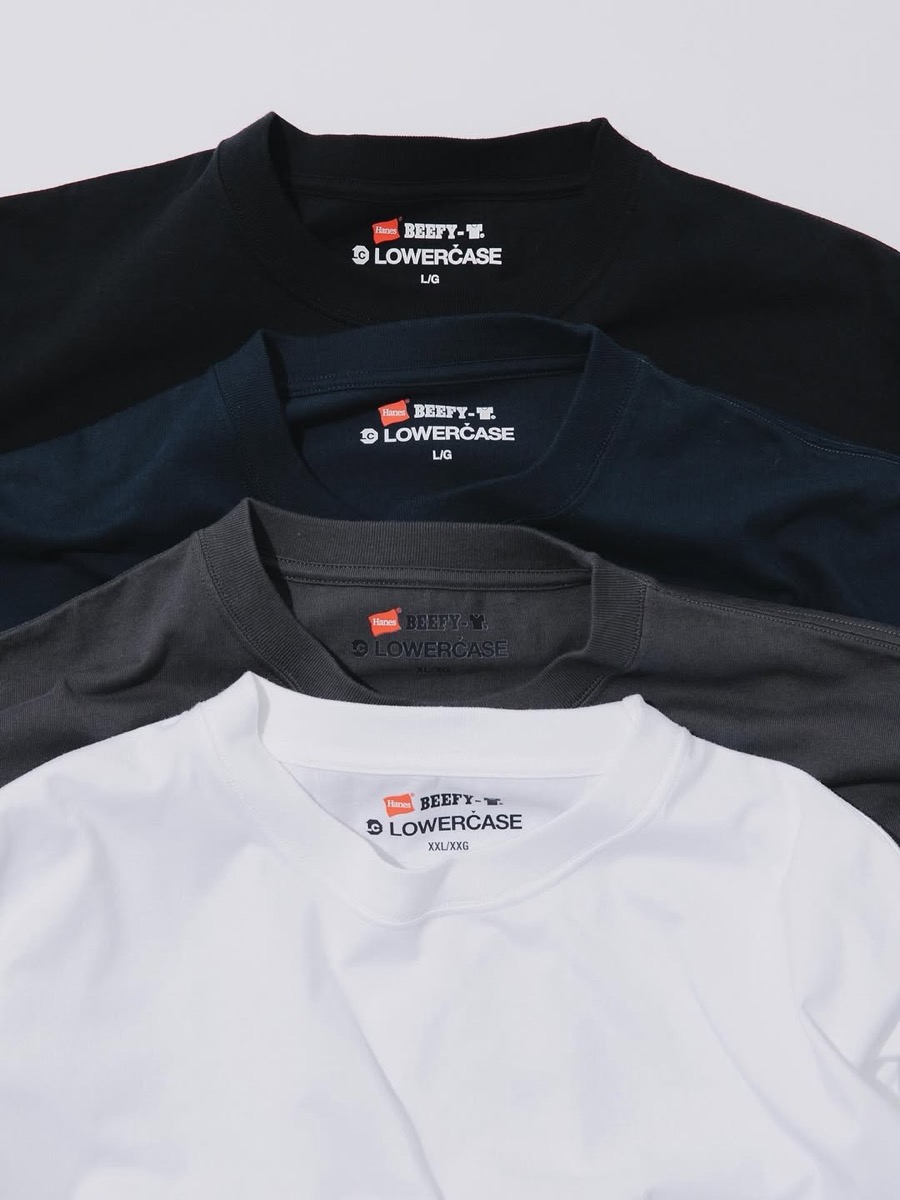 HANES x LOWERCASEの別注BEEFY-Tが登場。1975年の誕生以来長きにわたり支持され続ける「BEEFY-T®︎」をベースとしつつ、一枚でも着れるしっかりとした質感と適度にリラックス感のあるシルエットが、従来のBeefyにないものに。スウェット等の下に着ても良し、シャツを羽織りで合わせても良しの今まさに欲しいアイテムとなっている。カラーはホワイト、ブラック、ネイビー、ダークグレーが展開。