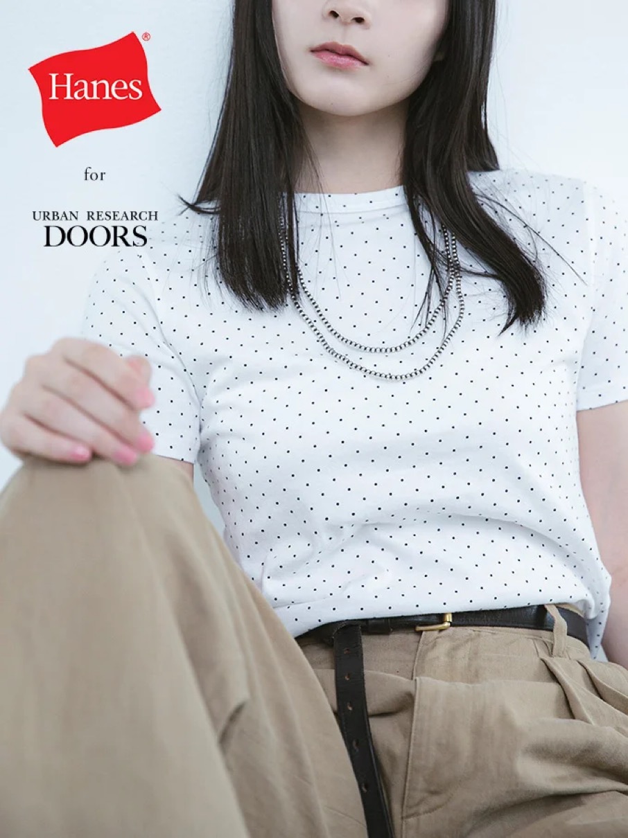 Hanes(ヘインズ)を象徴する、Japan Fit for HER(ジャパン フィット フォー ハー)。5.3オンスの綿100%素材を採用しており、1枚で着用しても透けにくく、厚すぎない絶妙なバランス。着用の当初から着慣れた風合いが味わえるガーメントウォッシュ加工をしている。今回URBAN RESEARCH DOORSでは、ヘインズ別注初となるドットデザインを採用。ドットの大きさや並びは、何度も試行錯誤を繰り返し、 可愛くなりすぎず、大人にちょうどいい「絶妙なバランス」に仕上げた。緩やかなネックラインなど日本人女性の体形に合わせたシルエットで絶妙なフィット感を実現。ウエストをシェイプすることで女性らしく着られる形を追及している。