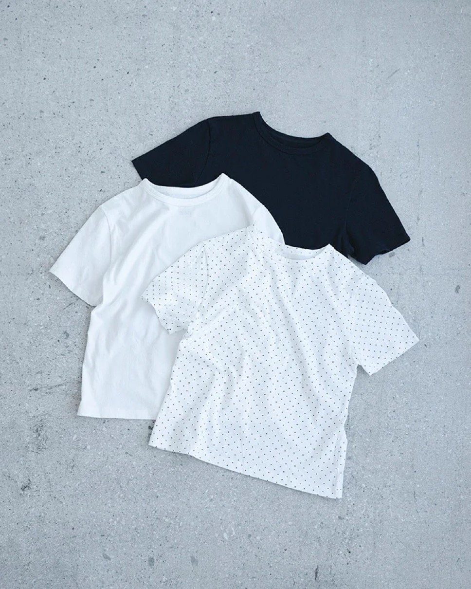 カラーはドット柄をベースにした WHT×DOT / NVY×DOT の2色展開。シンプルでありながら、着心地の良さと日常使いしやすい汎用性を追求したTシャツに仕上げた。毎日のワードローブに自然と馴染み、長く愛用できる特別なTシャツを楽しもう。